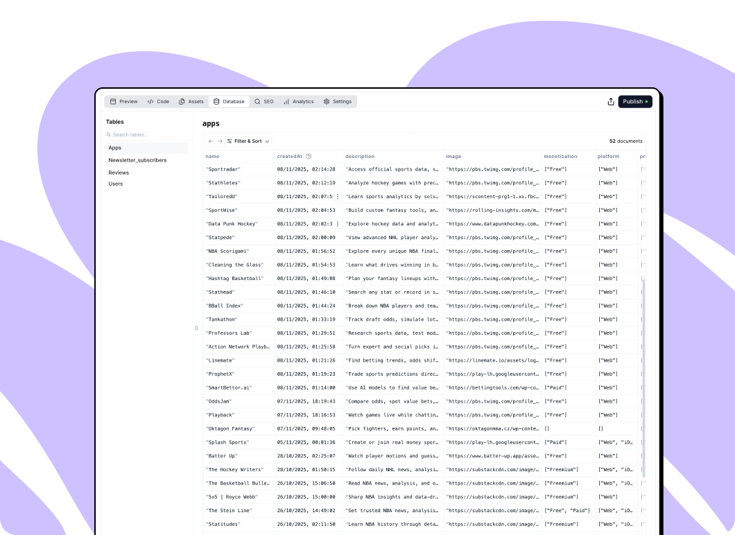 User accounts, blog posts, product catalogs, whatever. Add tables and manage data.
