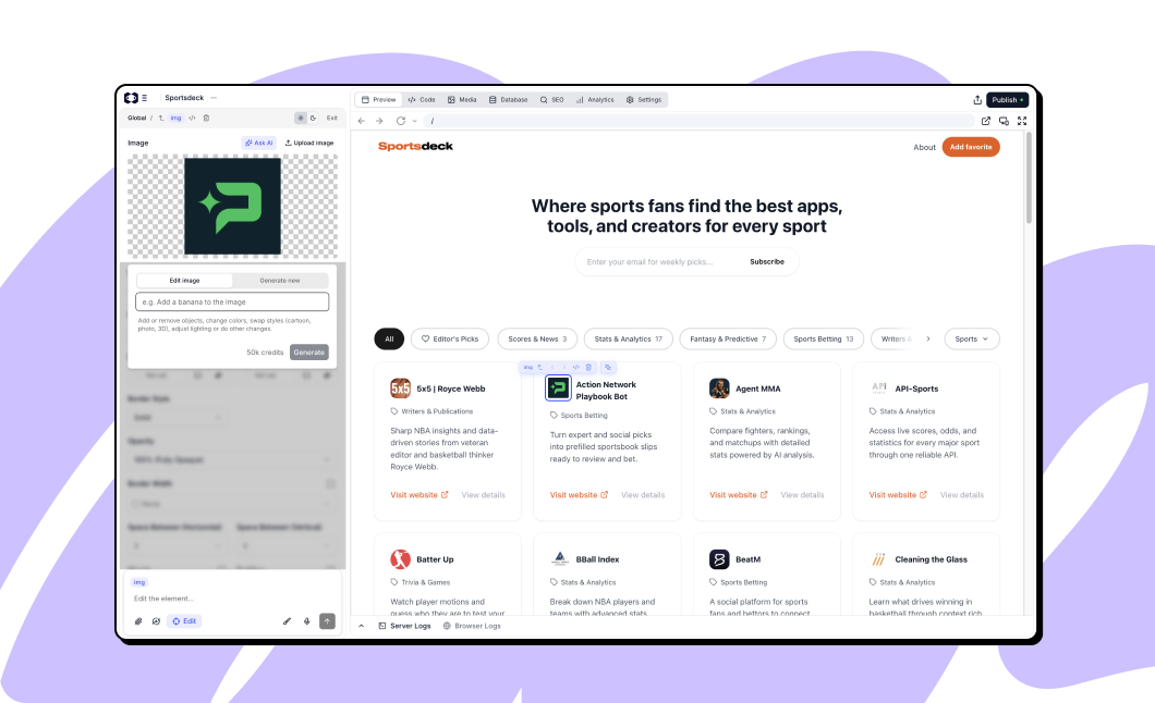 Hero images, backgrounds, icons, graphics. All generated without bugging a designer.