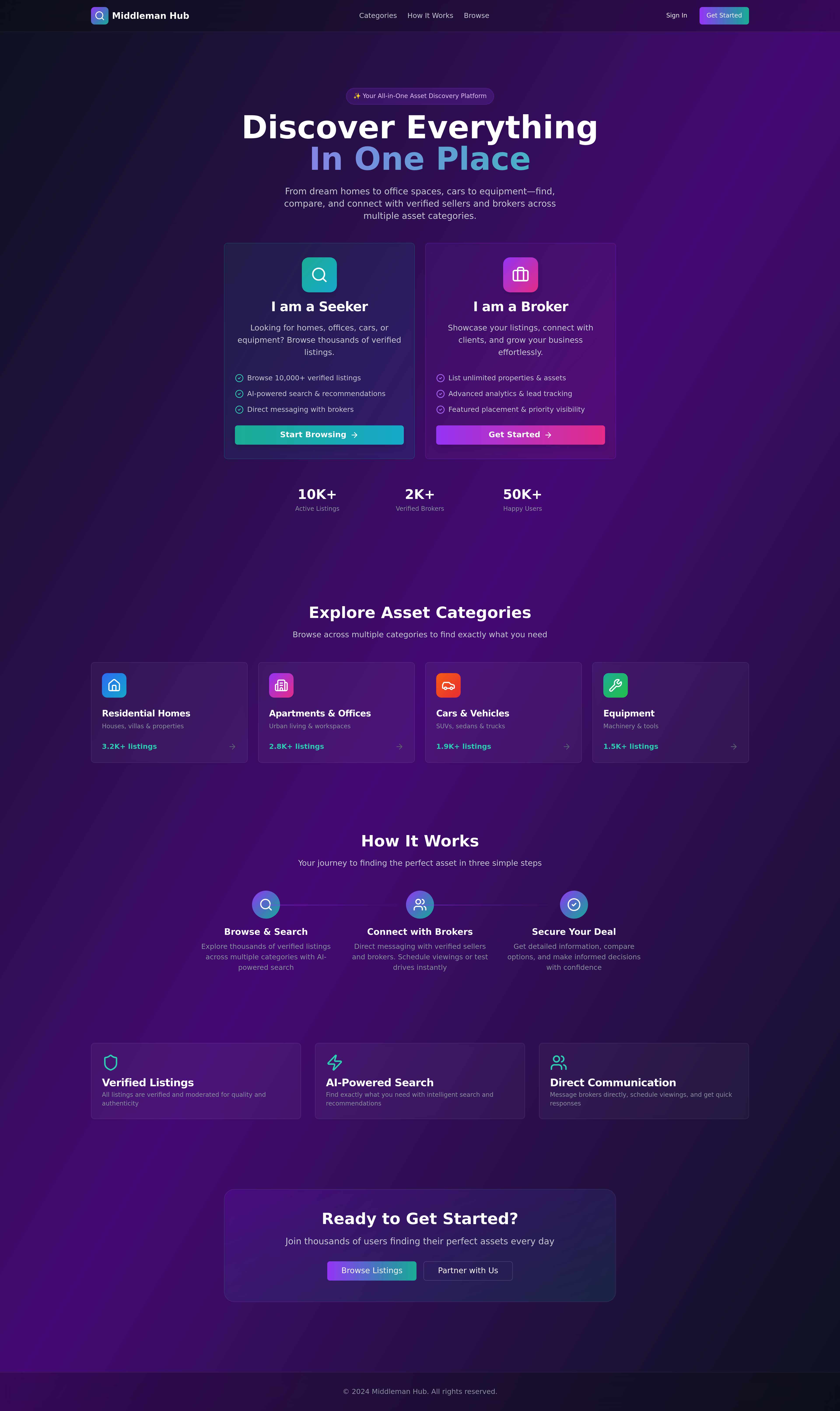 Discover a unified platform for multi-asset discovery, connecting seekers with brokers across real estate (homes, apartments, office spaces), cars, and other rentable or purchasable listings. This AI-powered platform offers dynamic filtering, AI-assisted search, in-app messaging, and dual-sided subscriptions for both seekers and brokers. Built with a Supabase backend, it features robust authentication, real-time updates, and comprehensive admin tools for crawl management and moderation.