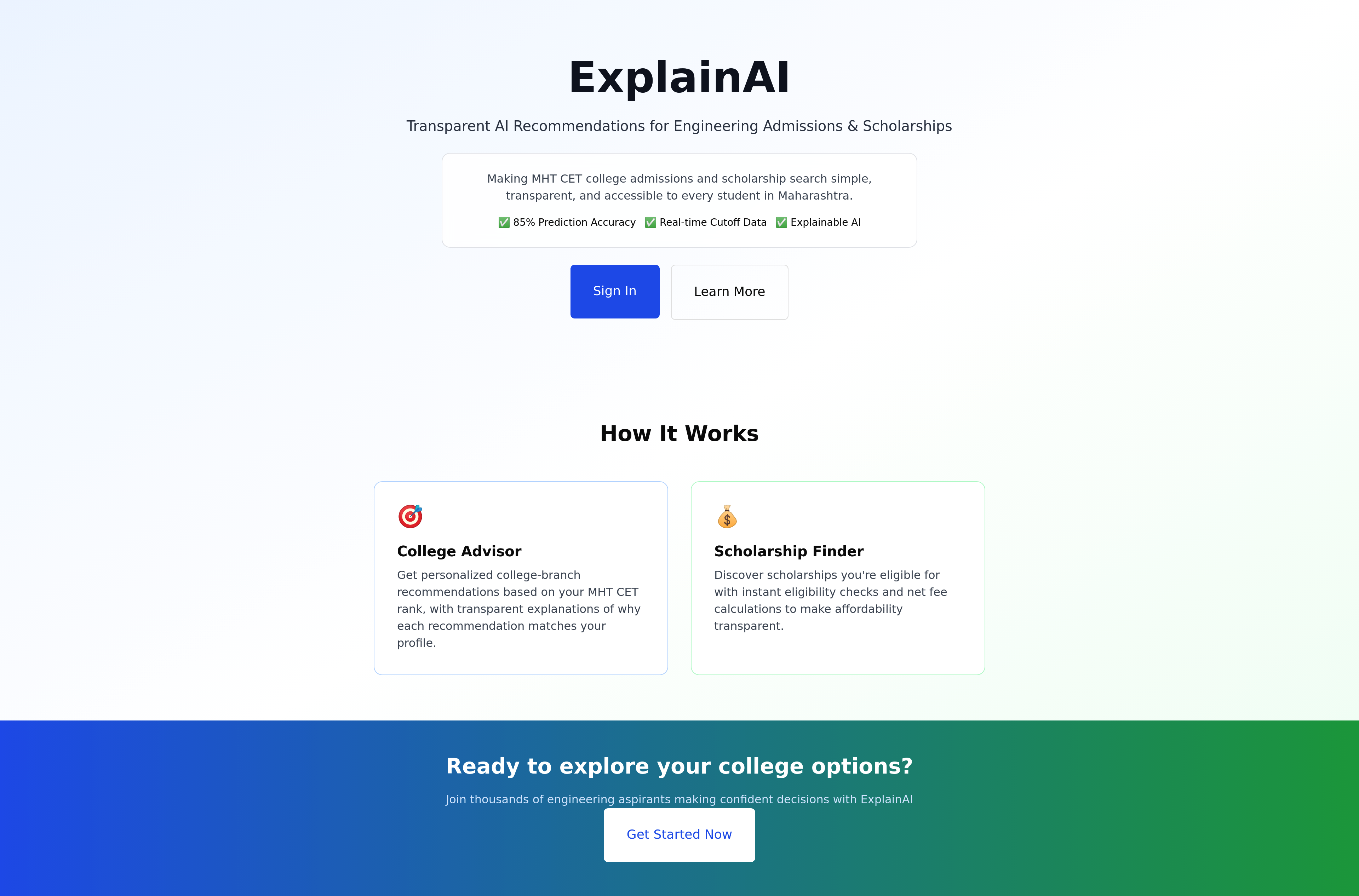 ExplainAI is a multi-domain intelligent recommendation system designed for MHT CET engineering students in Maharashtra. This PWA/hybrid app offers transparent AI recommendations for college admissions and scholarships, featuring explainable AI (XAI) for trust. Key features include college-branch prediction with visual "why" explanations, scholarship matching with eligibility breakdowns, and a comprehensive integrated plan. It aims to save research time and reduce dropouts for 17-20 year old aspirants and their parents, providing accurate, personalized guidance for their academic journey.