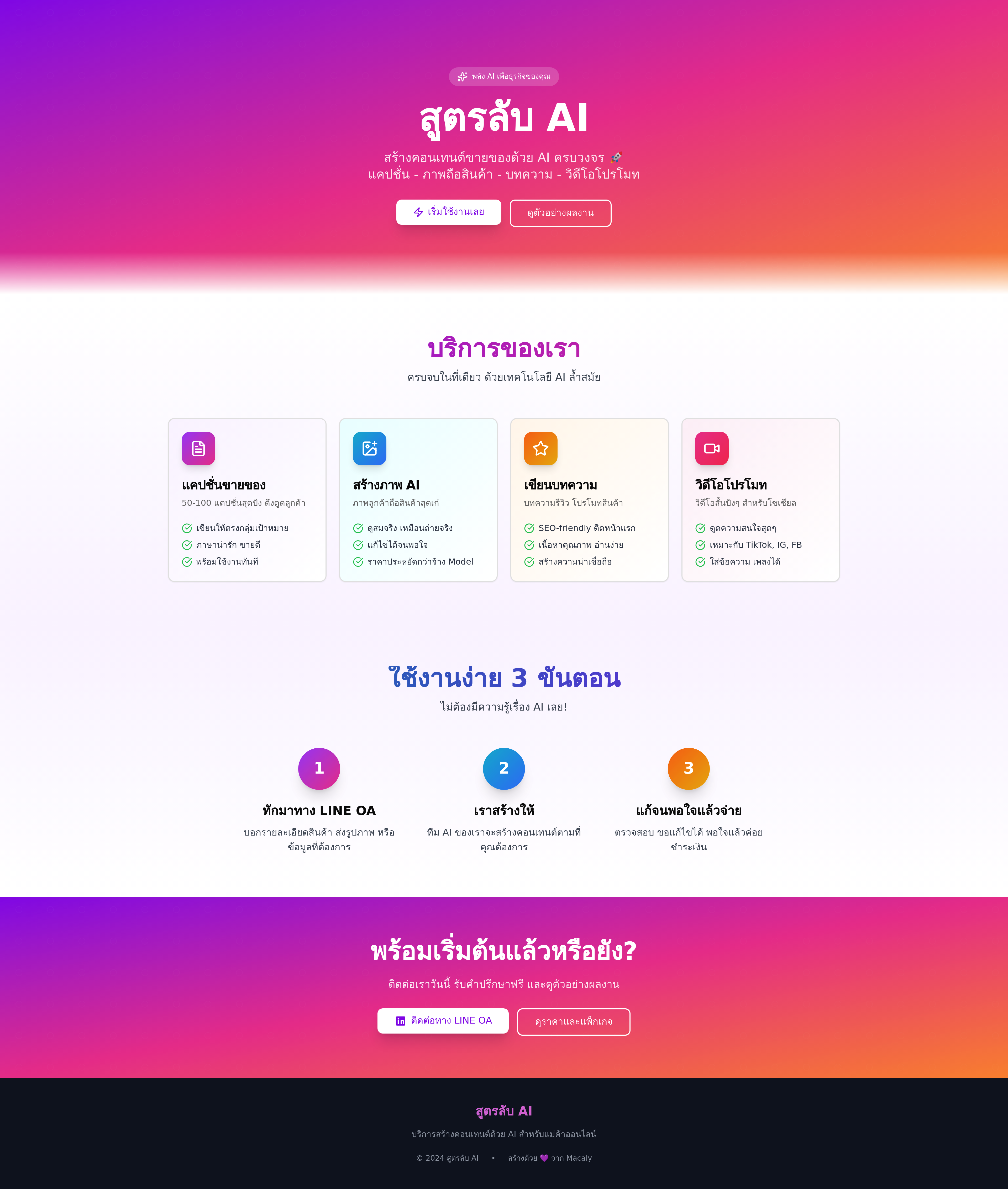AI-powered content creation platform for online merchants. "สูตรลับ AI" offers bespoke captions (50-100 options), AI-generated product images, engaging articles, and promotional videos. This web application helps e-commerce businesses and online sellers elevate their marketing efforts by providing high-quality, tailored content. Users can submit requests via LINE OA, receive custom content, and pay upon satisfaction. Discover how AI can transform your online presence and boost sales.