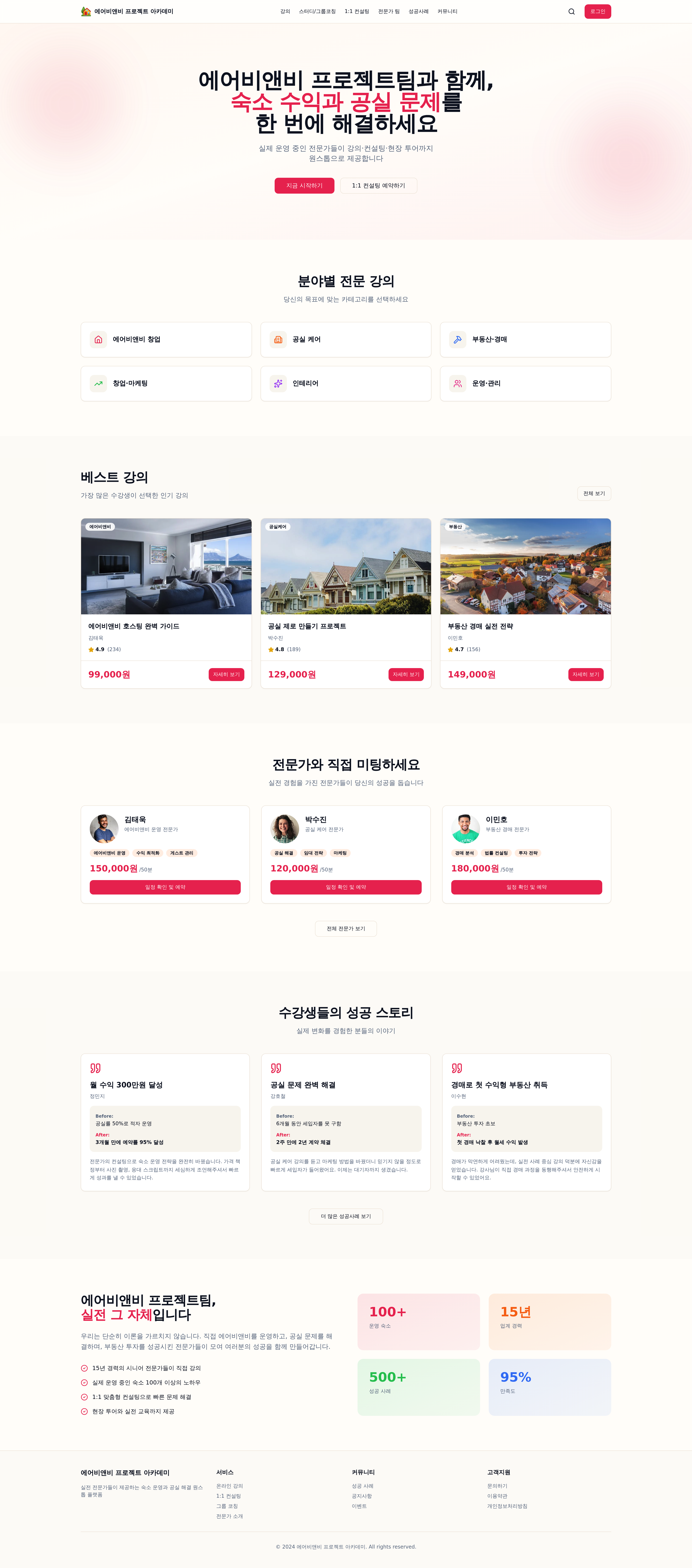 An online learning and consulting platform for aspiring and current Airbnb hosts, real estate investors, and property owners. This platform offers expert-led courses, 1:1 and group coaching, and consulting services on Airbnb entrepreneurship, property management, real estate investment, legal and tax advice, interior design, and marketing. Designed with an intuitive UI inspired by Airbnb and Hank-Edu, it provides a comprehensive solution for maximizing rental income and solving vacancy issues.