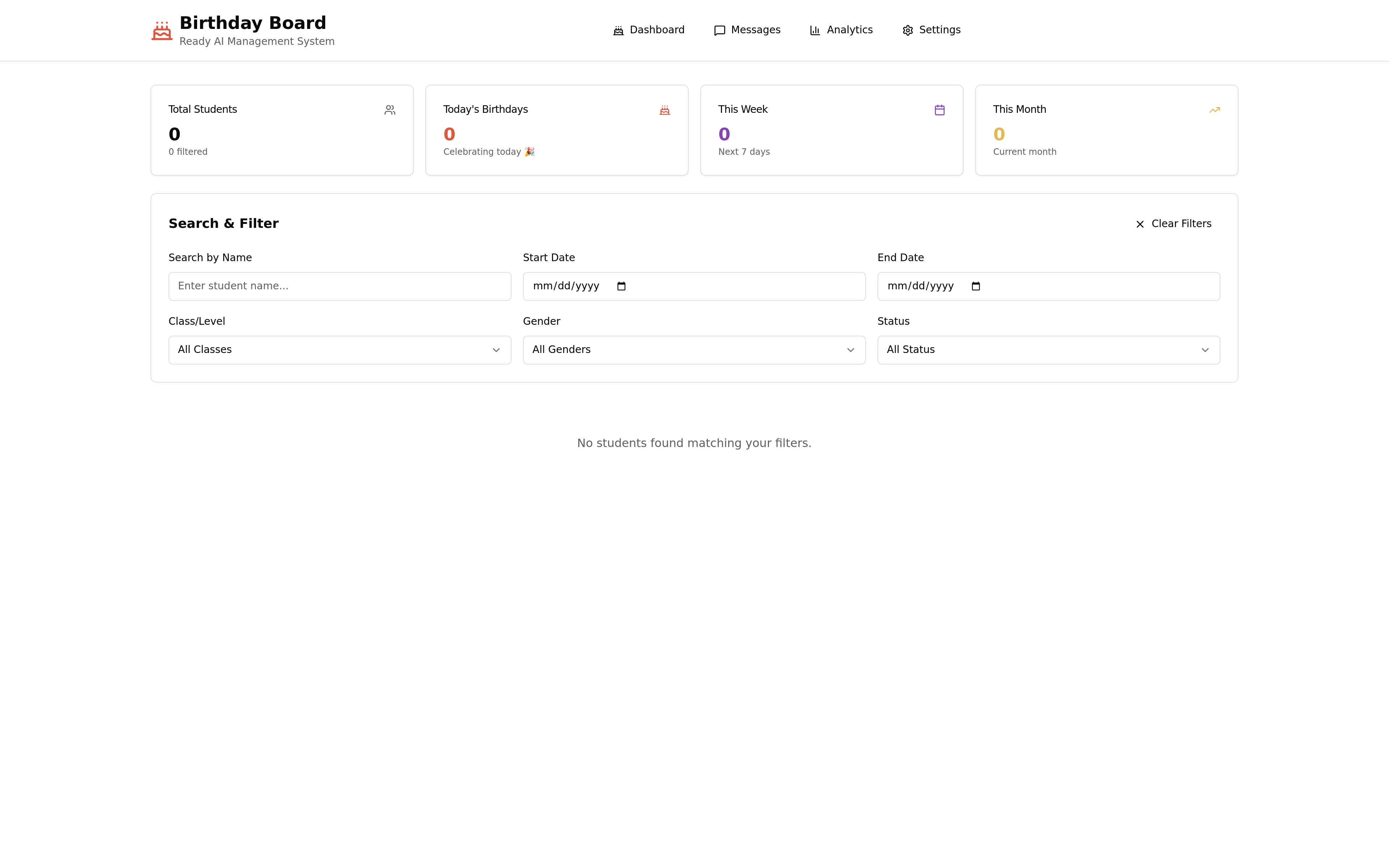 A modern, visually engaging Birthday Board Management System for schools, featuring smooth card layouts, clean typography, and a warm celebratory theme. This web application provides administrators with an interactive dashboard to manage upcoming birthdays, send custom notifications via SMS or email, generate detailed reports, and gain insights through analytics. Key features include advanced filtering, customizable message templates, delivery tracking, and robust settings for seamless integration into any school management system.