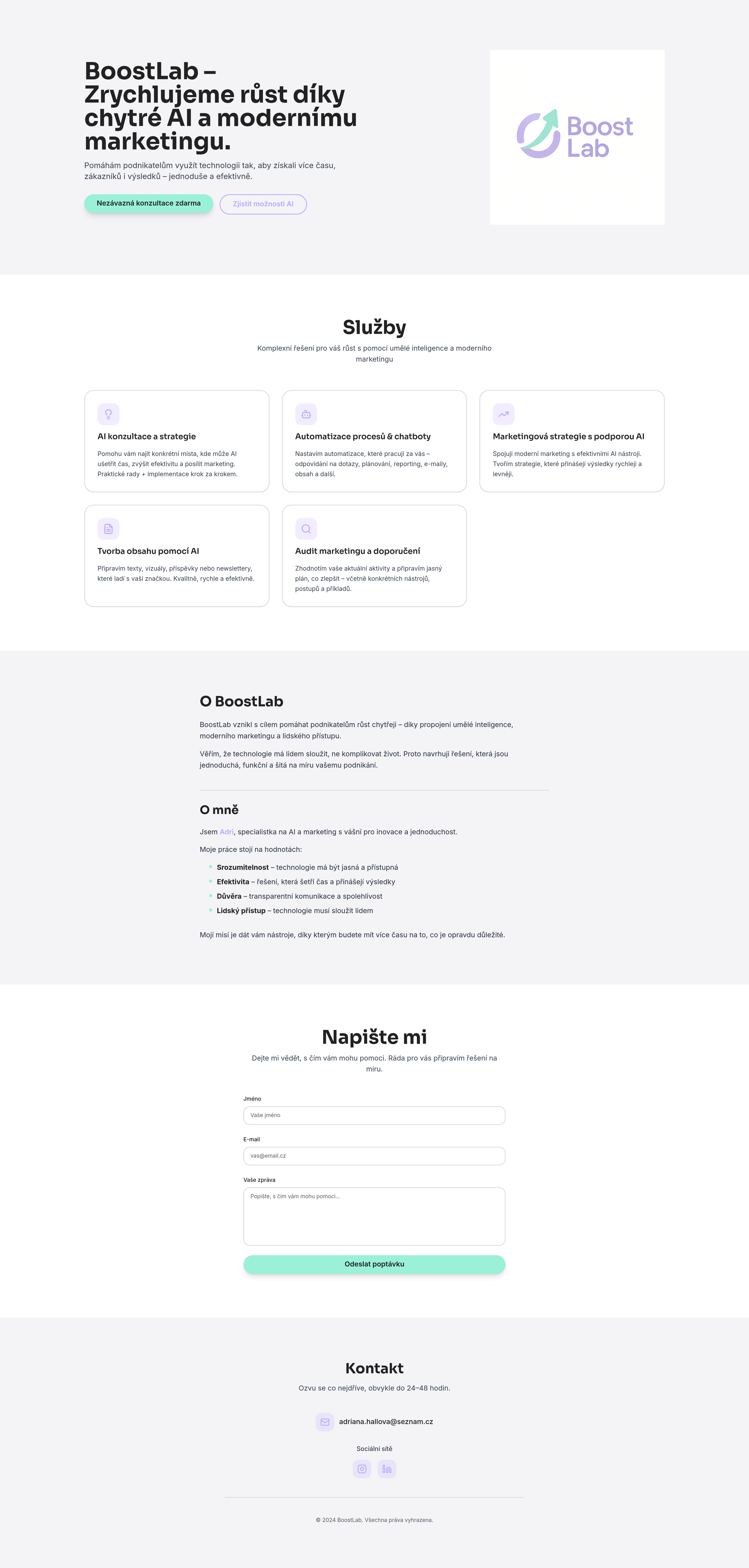 BoostLab offers AI-powered marketing and automation solutions for businesses. This modern, minimalist website design features a clean aesthetic with pastel purple and mint accents, intuitive navigation, and clear calls to action. Discover AI consultations, process automation, content creation, and marketing audits to accelerate your business growth.