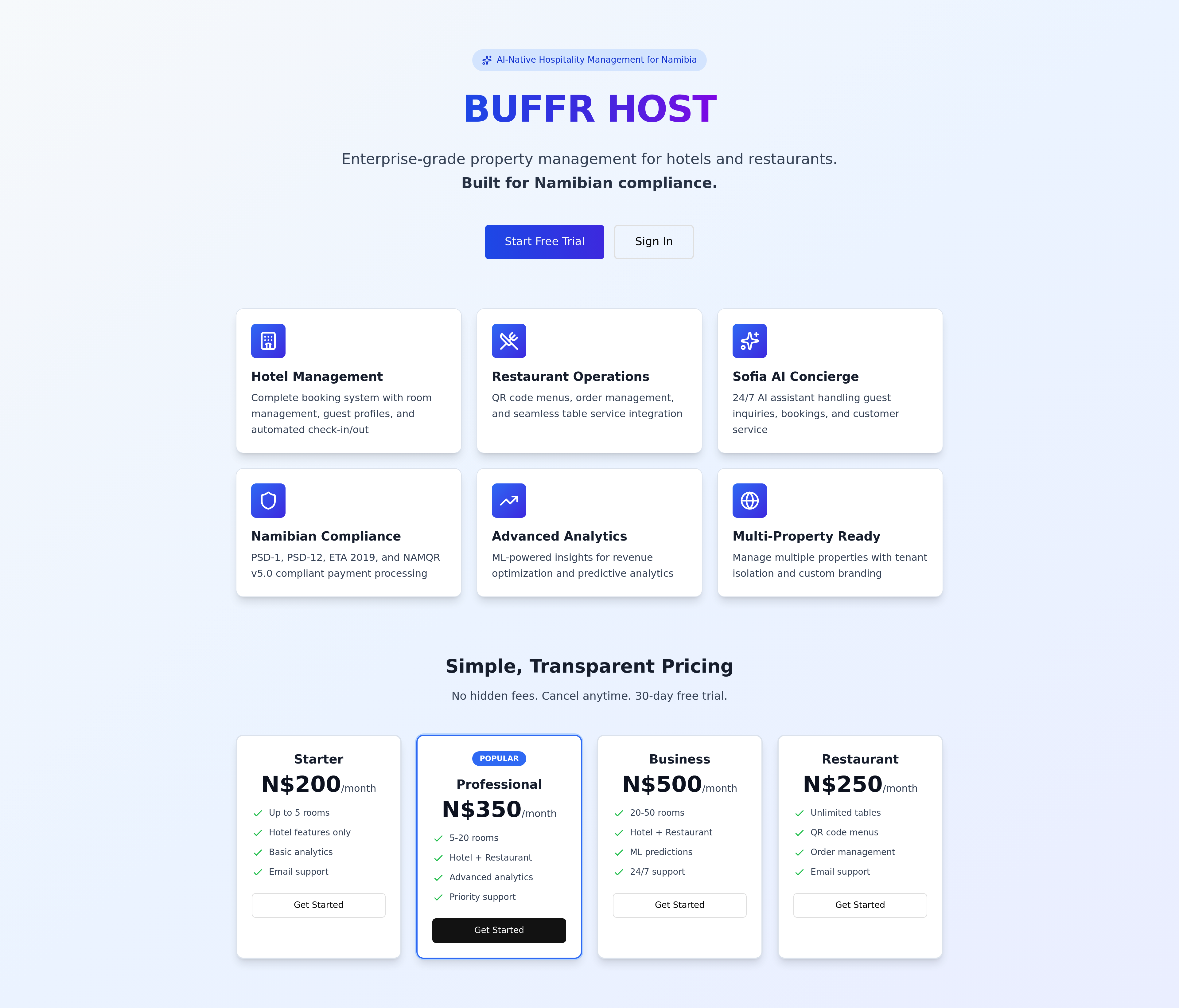 Buffr Host is an enterprise-grade, AI-native hospitality management platform designed for the Namibian market. It offers end-to-end property management for hotels and restaurants, autonomous AI guest experience orchestration with Sofia Concierge, and comprehensive compliance with Namibian financial regulations. Key features include a configurable RBAC system, QR code menus, integrated payment processing, and advanced analytics for hotels and restaurants.