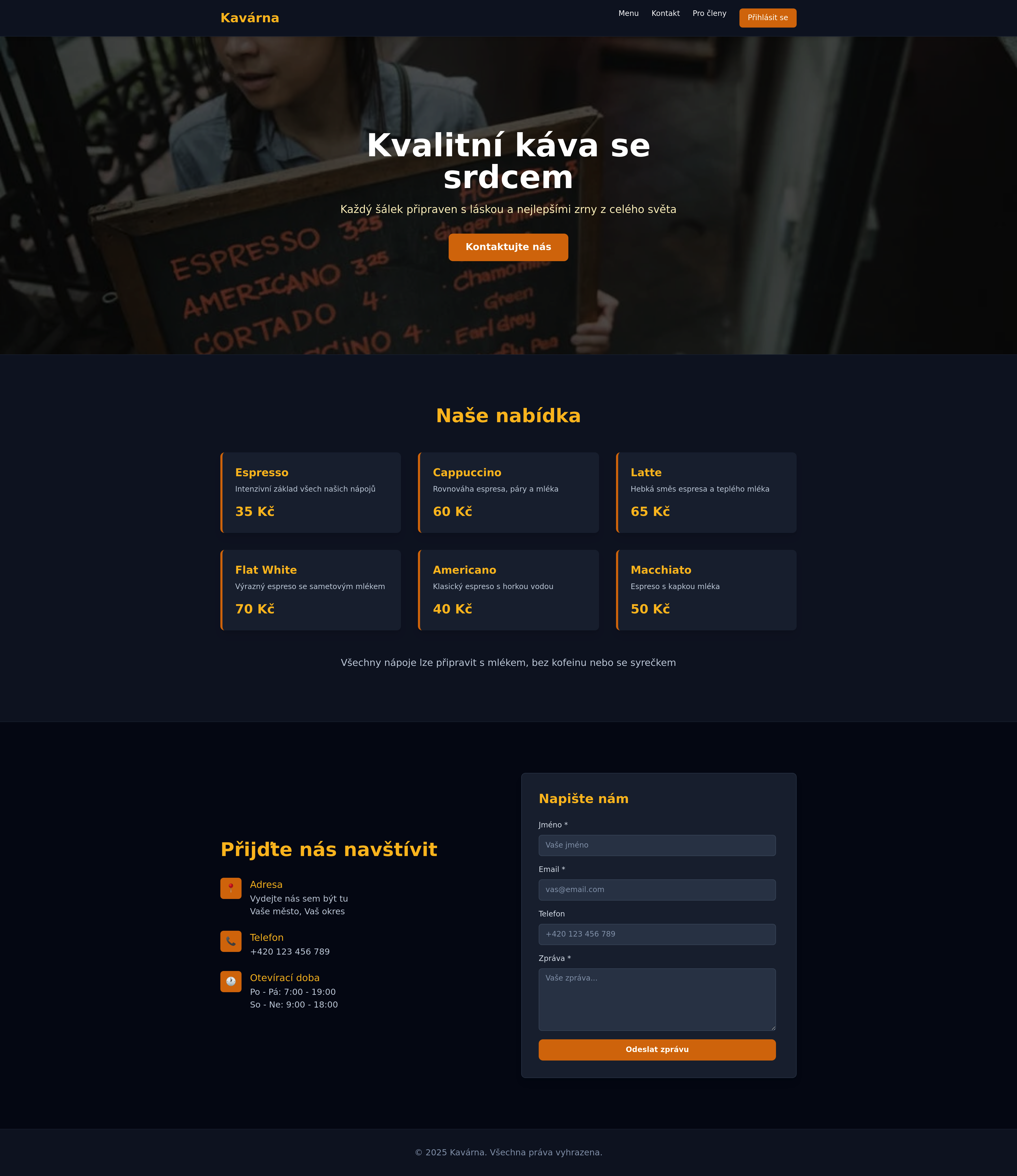 Vytvořte si profesionální webové stránky pro kavárnu s úvodní fotografií, přehlednou nabídkou produktů a kontaktním formulářem. Zvyšte online přítomnost vaší kavárny a usnadněte zákazníkům objednávky a dotazy. Ideální pro majitele kaváren a baristů, kteří chtějí oslovit více zákazníků online.