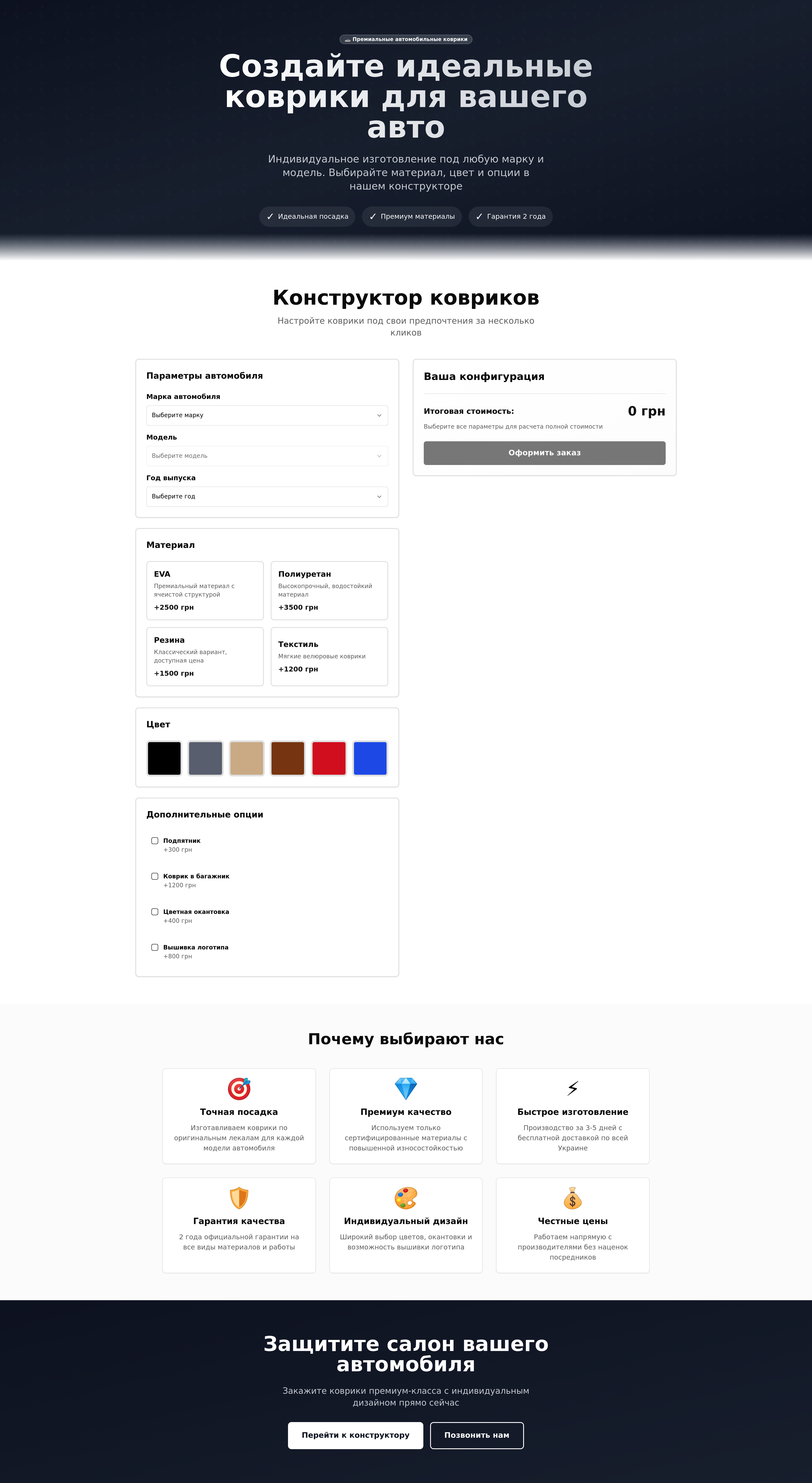 Создайте свой идеальный автомобильный коврик на заказ с помощью нашего онлайн-конструктора. Выбирайте материалы, цвета и дизайн для салона вашего автомобиля. Индивидуальные автомобильные коврики, сделанные на заказ, для любой марки и модели. Защитите свой автомобиль с помощью высококачественных, прочных и легко чистящихся ковриков.