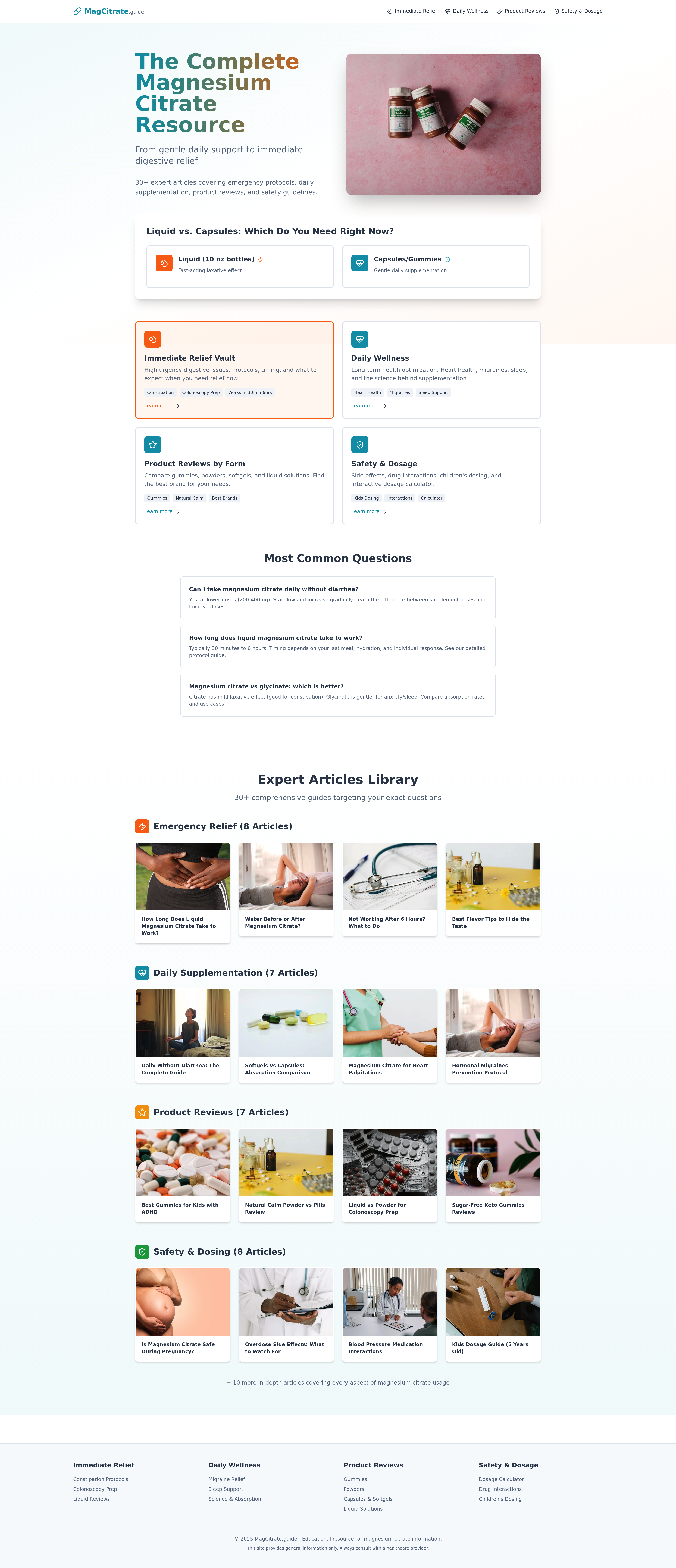 Discover everything about Magnesium Citrate, from immediate constipation relief to daily wellness support. This comprehensive resource offers detailed guides on acute use, daily supplementation, product reviews, and safety information, including a dosage calculator. Explore liquid vs. capsules, colonoscopy prep, migraine relief, and compare different forms like gummies and powders. Your go-to guide for informed magnesium citrate use.