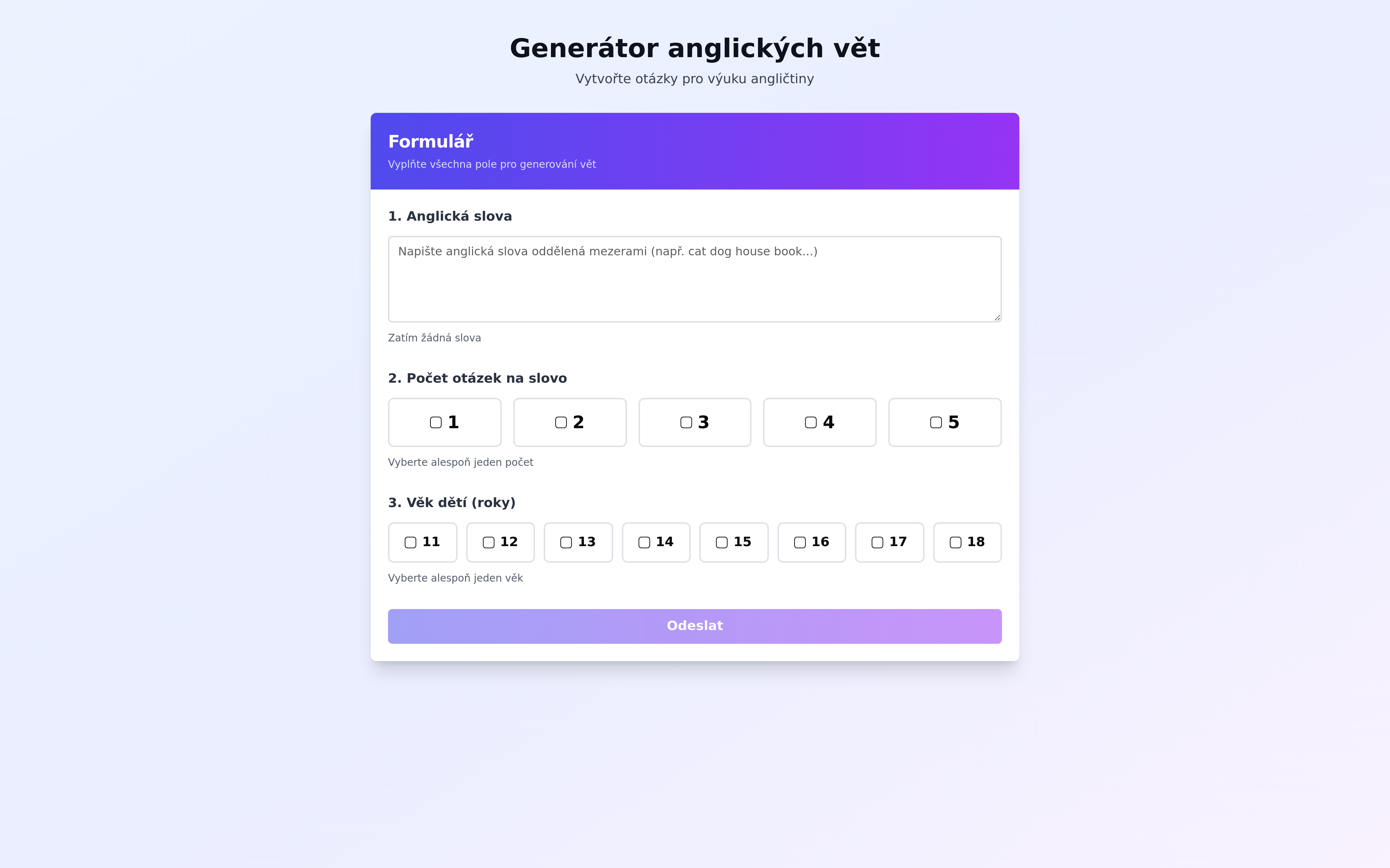 An interactive English sentence generator web application designed for language learners. Users can input English words, specify the number of questions to generate per word (1-5), and select age ranges (11-18) for tailored sentence creation. This tool is ideal for educators and students looking to practice English sentence construction and grammar.