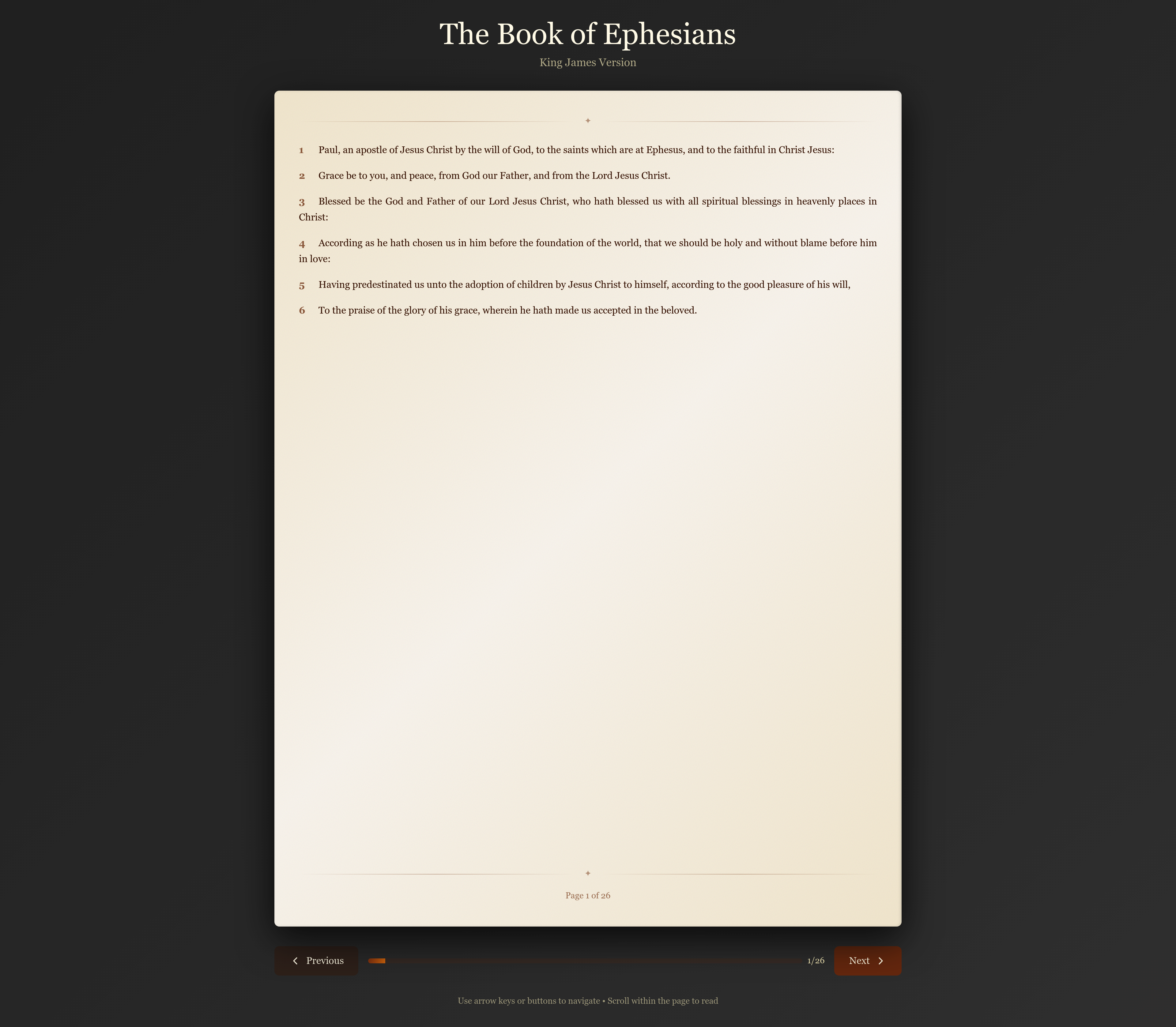 Explore the Book of Ephesians with an interactive, digital KJV Bible. This web-based experience features beautifully designed, turnable parchment-like pages, offering a unique and immersive way to read and study scripture online. Perfect for personal devotion, Bible study groups, and theological research.