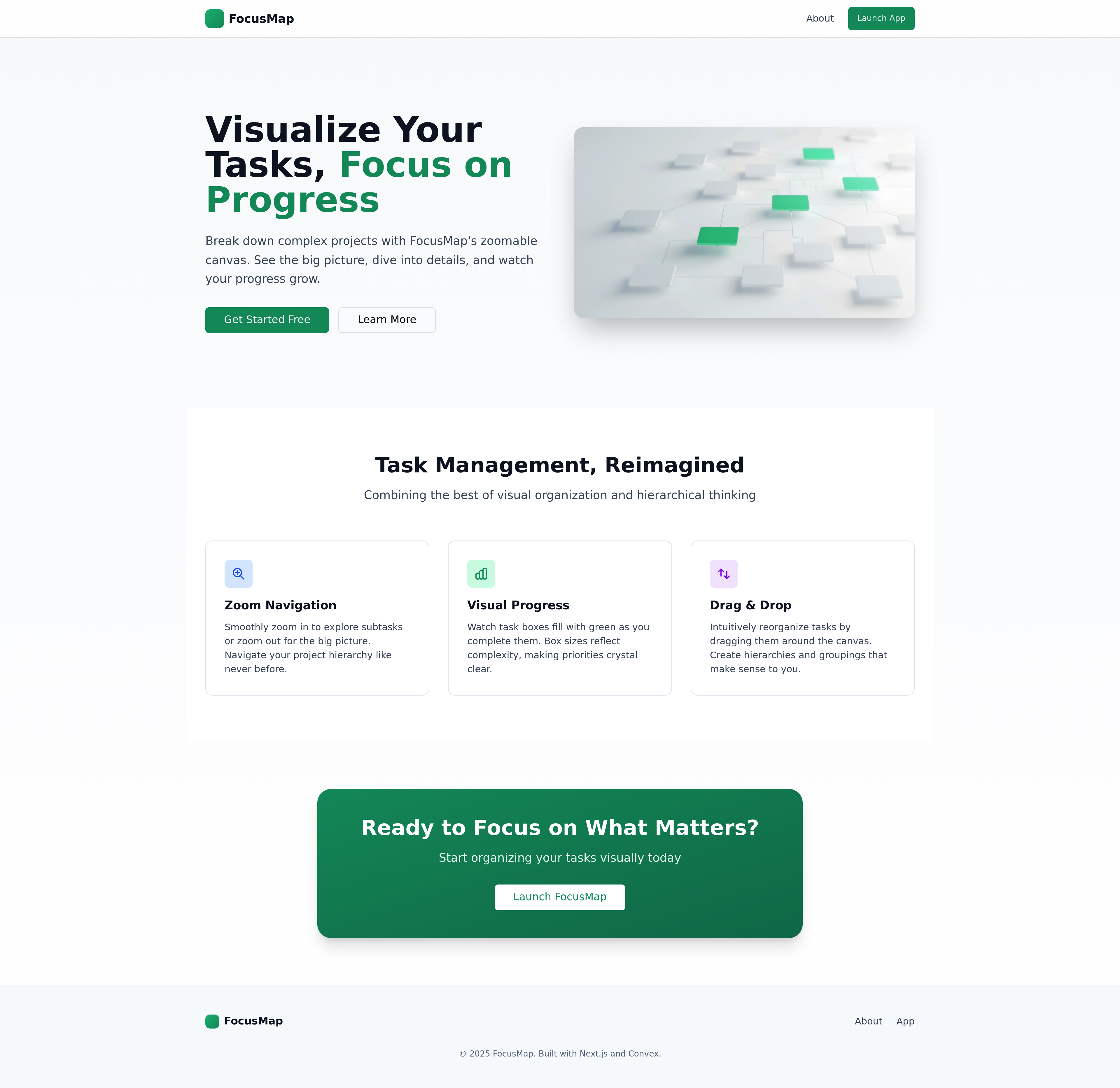 FocusMap is an innovative web application designed to revolutionize task management with a unique zoomable graphic interface. Inspired by Prezi, Workflowy, and data visualization treemaps, this productivity tool allows users to visually break down projects into hierarchical tasks and subtasks. Key features include intuitive drag-and-drop functionality, dynamic task box sizing based on subtasks or estimated time, and a clear visual progress indicator with color-coded completion. The clean, minimal, and responsive UI ensures a distraction-free experience across desktop and mobile, making complex project organization simple and visually engaging. Perfect for individuals and teams seeking a powerful, intuitive, and visually-driven task management solution.