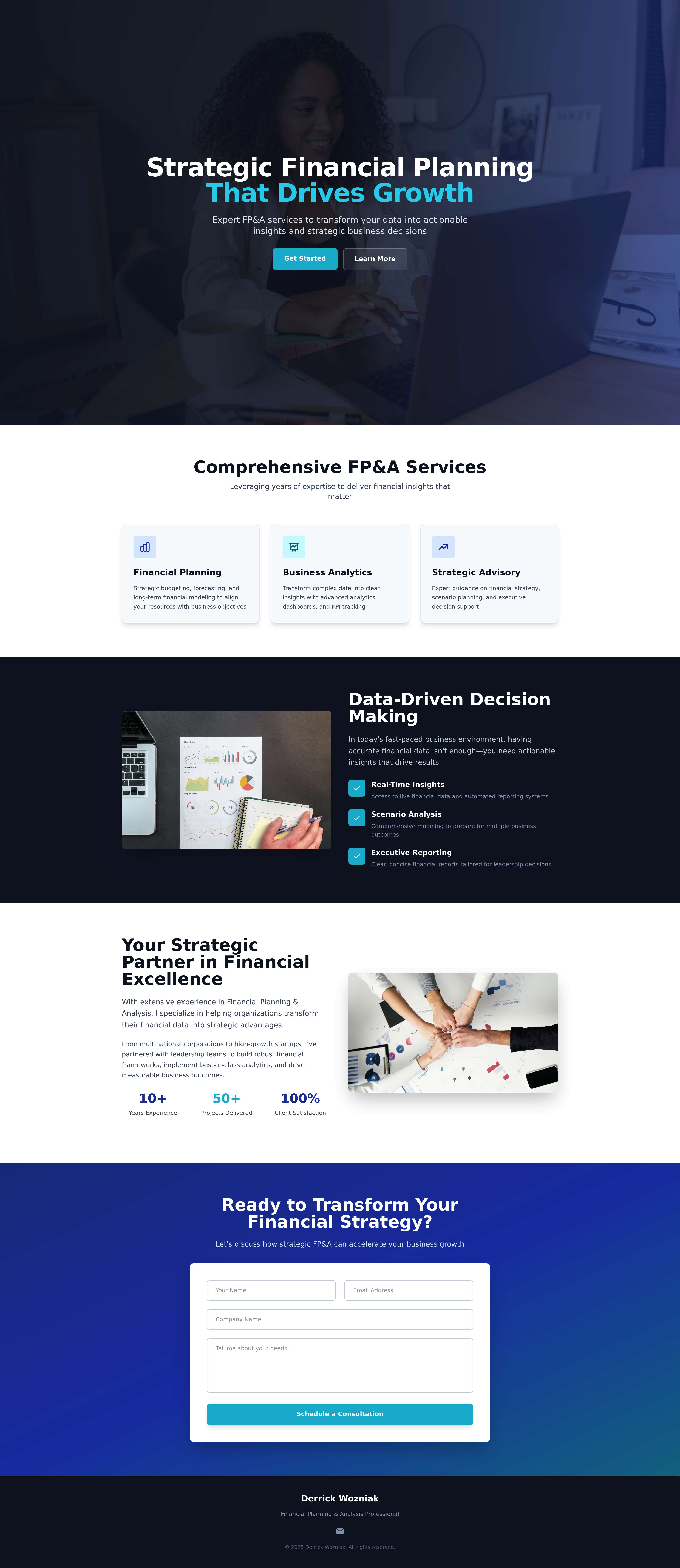 Showcase your financial expertise with this professional and engaging portfolio website. Designed for Financial Planning & Analysis (FP&A) professionals, this site highlights your skills, experience, and services to attract potential clients and employers. Featuring a clean, modern design and clear calls to action, it encourages visitors to explore your qualifications and connect with you for financial planning and analysis opportunities.