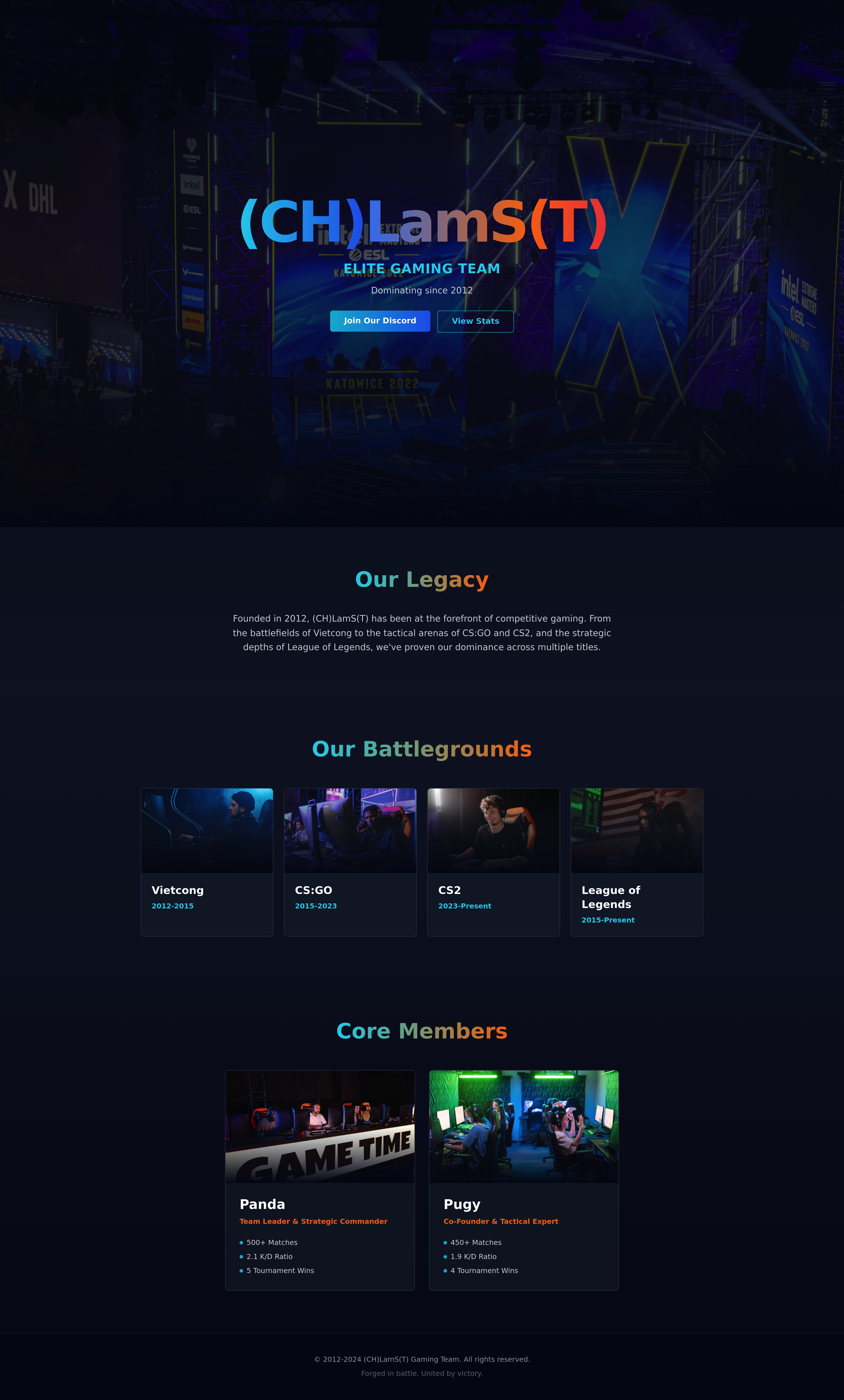 Explore the nostalgic 2012 gaming website for the legendary team (CH)LamS(T), featuring iconic players Panda and Pugy. This fan-centric site celebrates their journey through classic titles like Vietcong, CS:GO, CS2, and League of Legends, offering a deep dive into team history, achievements, and player profiles. Perfect for retro gaming enthusiasts and esports historians.