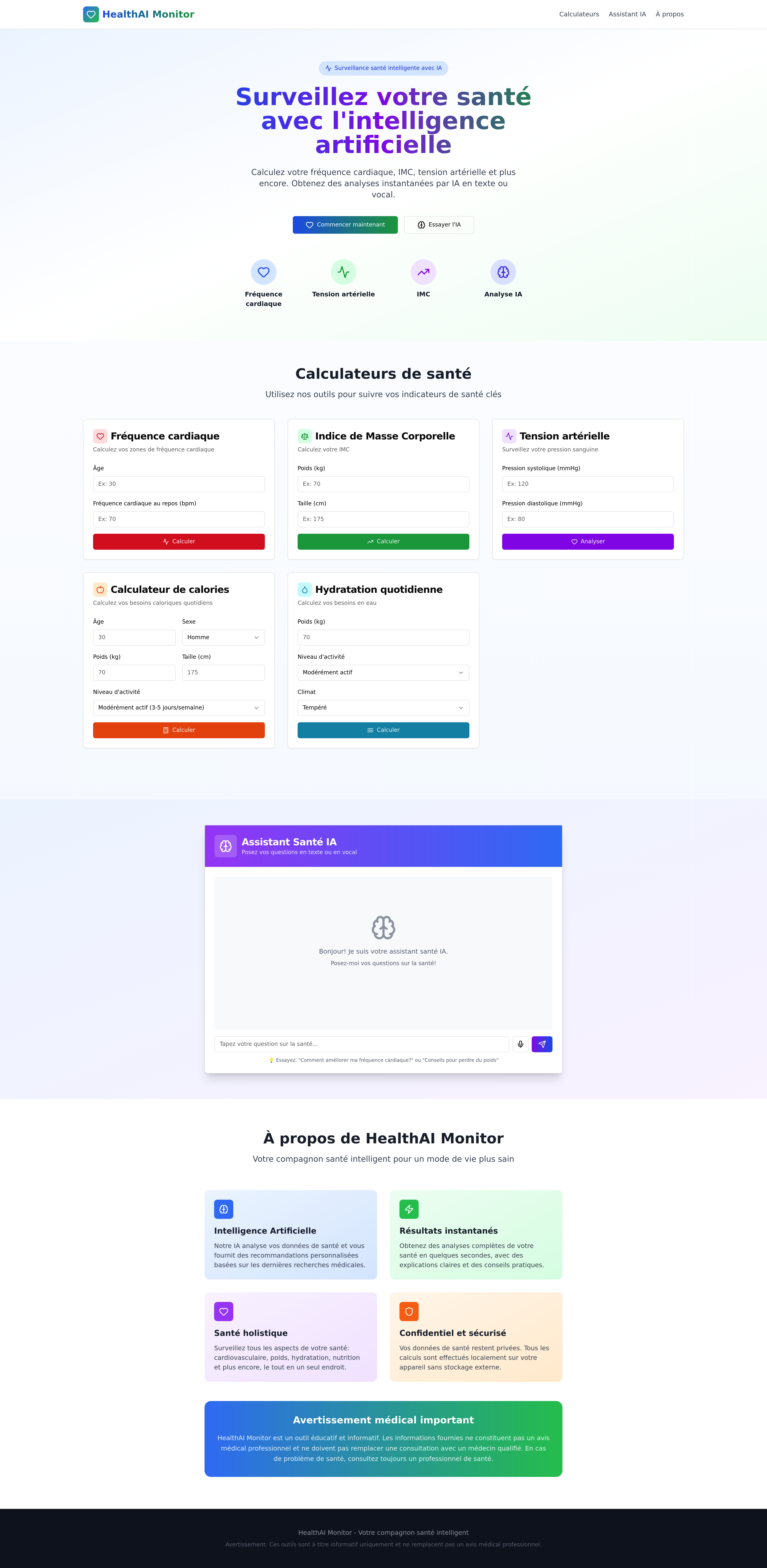 Découvrez un site web innovant pour le suivi de votre santé cardiaque. Calculez votre fréquence cardiaque, analysez vos données de santé et recevez des conseils personnalisés grâce à une IA intégrée. Cette plateforme offre une interaction vocale et écrite pour des évaluations instantanées et des recommandations sur votre bien-être cardiovasculaire. Idéal pour les particuliers soucieux de leur santé et les professionnels du bien-être.