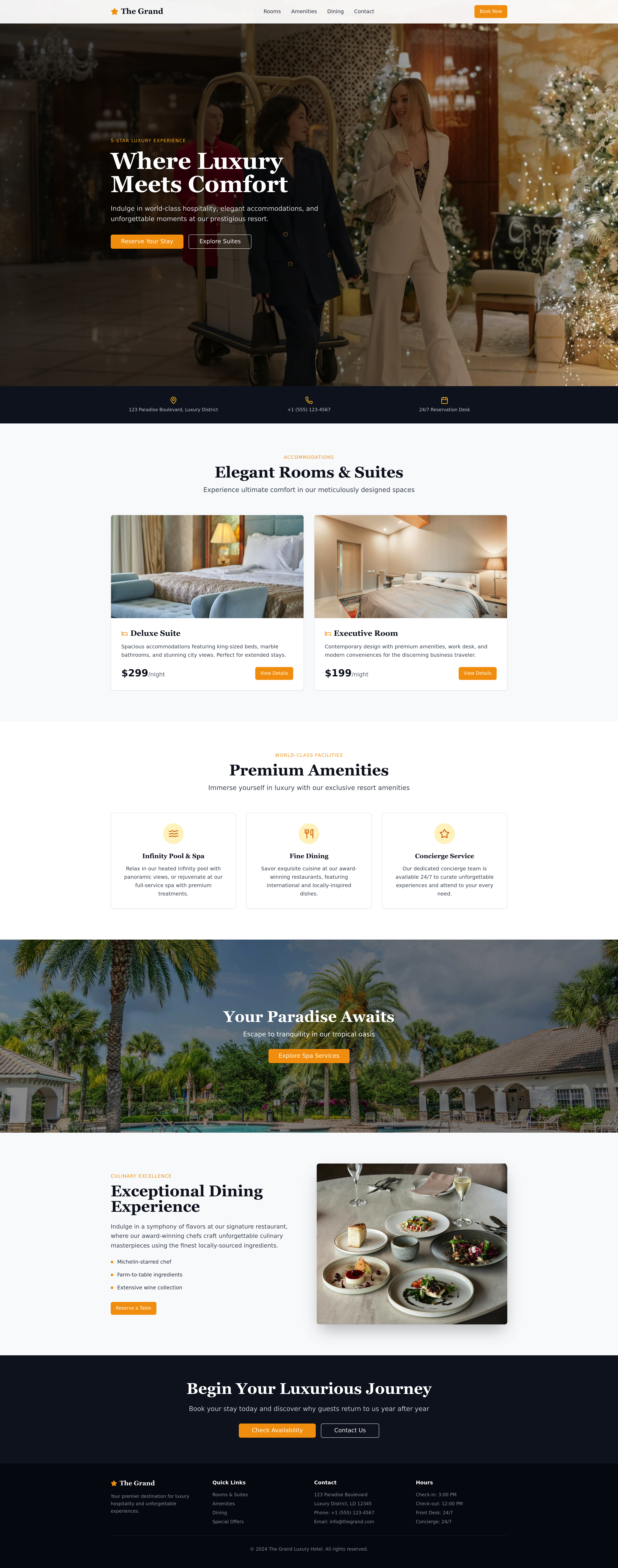 Discover a modern and elegant hotel homepage template designed to showcase luxurious accommodations, amenities, and booking options. This responsive website template is perfect for hotels, resorts, and guesthouses looking to attract guests and streamline their online presence with an intuitive user experience and stunning visuals.