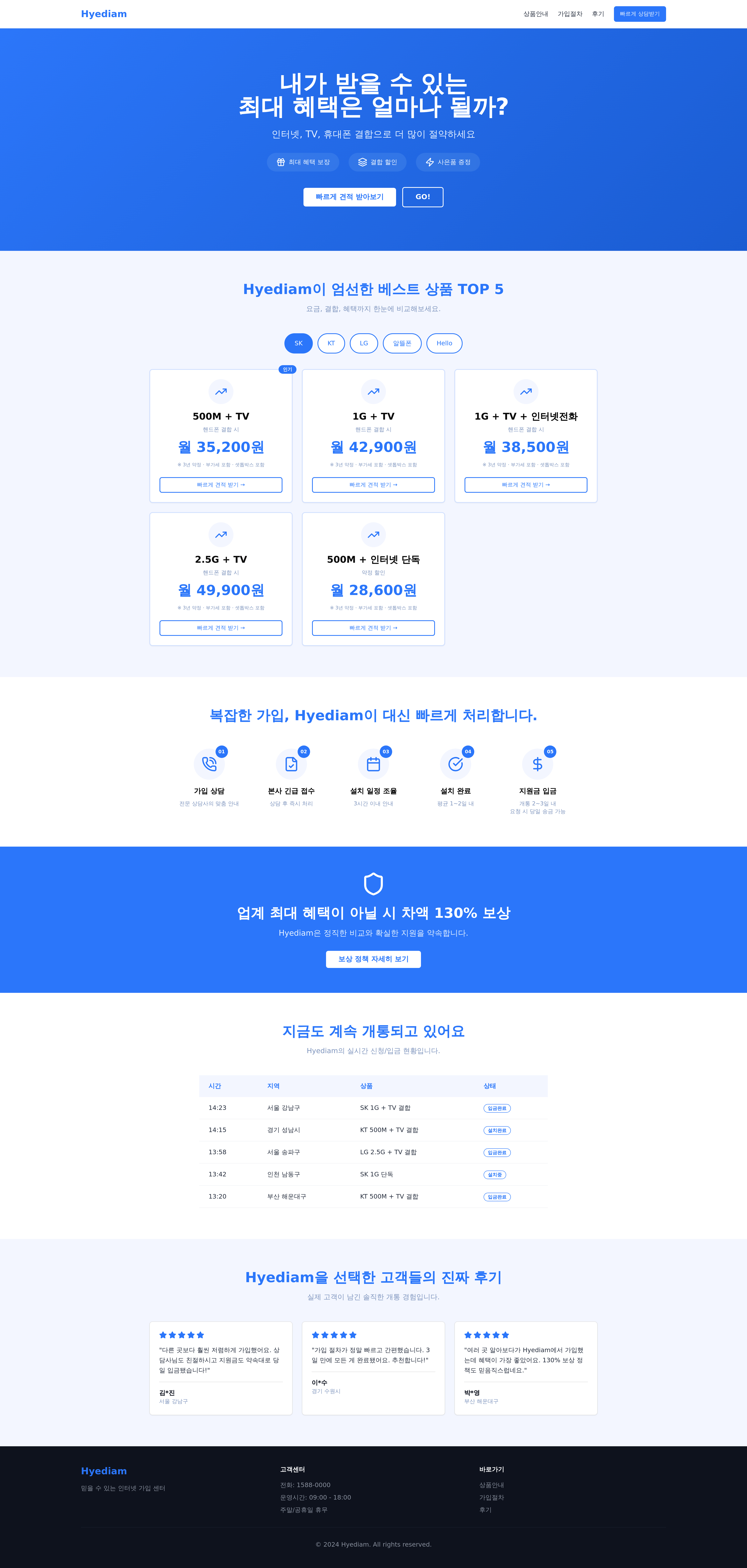 Discover Hyediam, your ultimate online destination for comparing and subscribing to the best internet and telecommunication plans in Korea. Get personalized quotes, compare top 5 plans from major carriers like SK, KT, LG, and Hello Mobile, and enjoy exclusive benefits with Hyediam's 130% compensation guarantee. Experience a seamless, fast, and reliable subscription process with expert guidance and real-time updates. Find your perfect internet plan today!