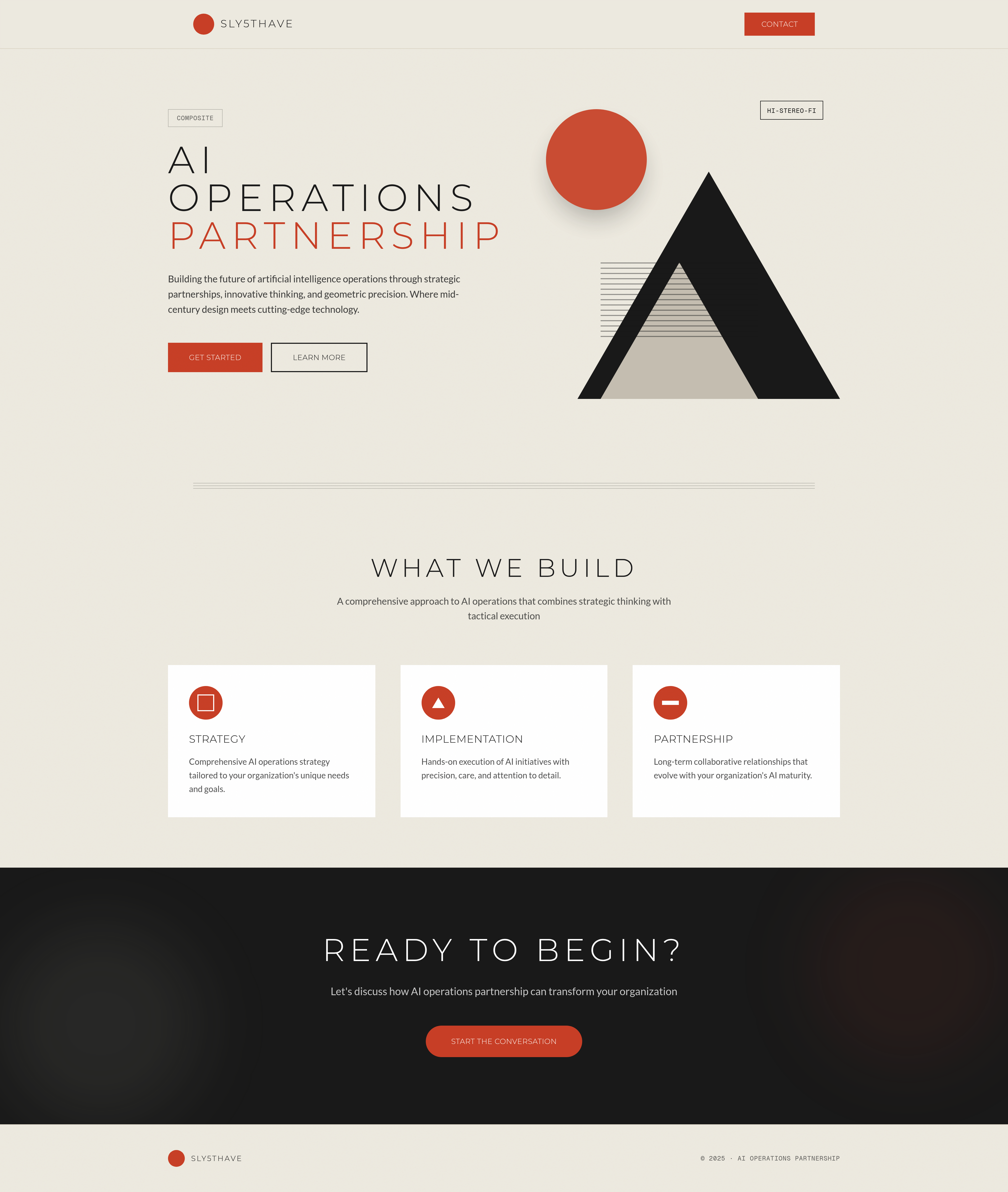 Showcase your AI operations partnership with a stunning landing page featuring a mid-century modern aesthetic. This template incorporates warm geometry, a sophisticated color palette of aged cream, burnt terracotta, and faded charcoal, and elegant typography (Montserrat/Josefin Sans, Lato/Nunito). Perfect for AI businesses, tech startups, and consulting firms seeking a unique and professional online presence.