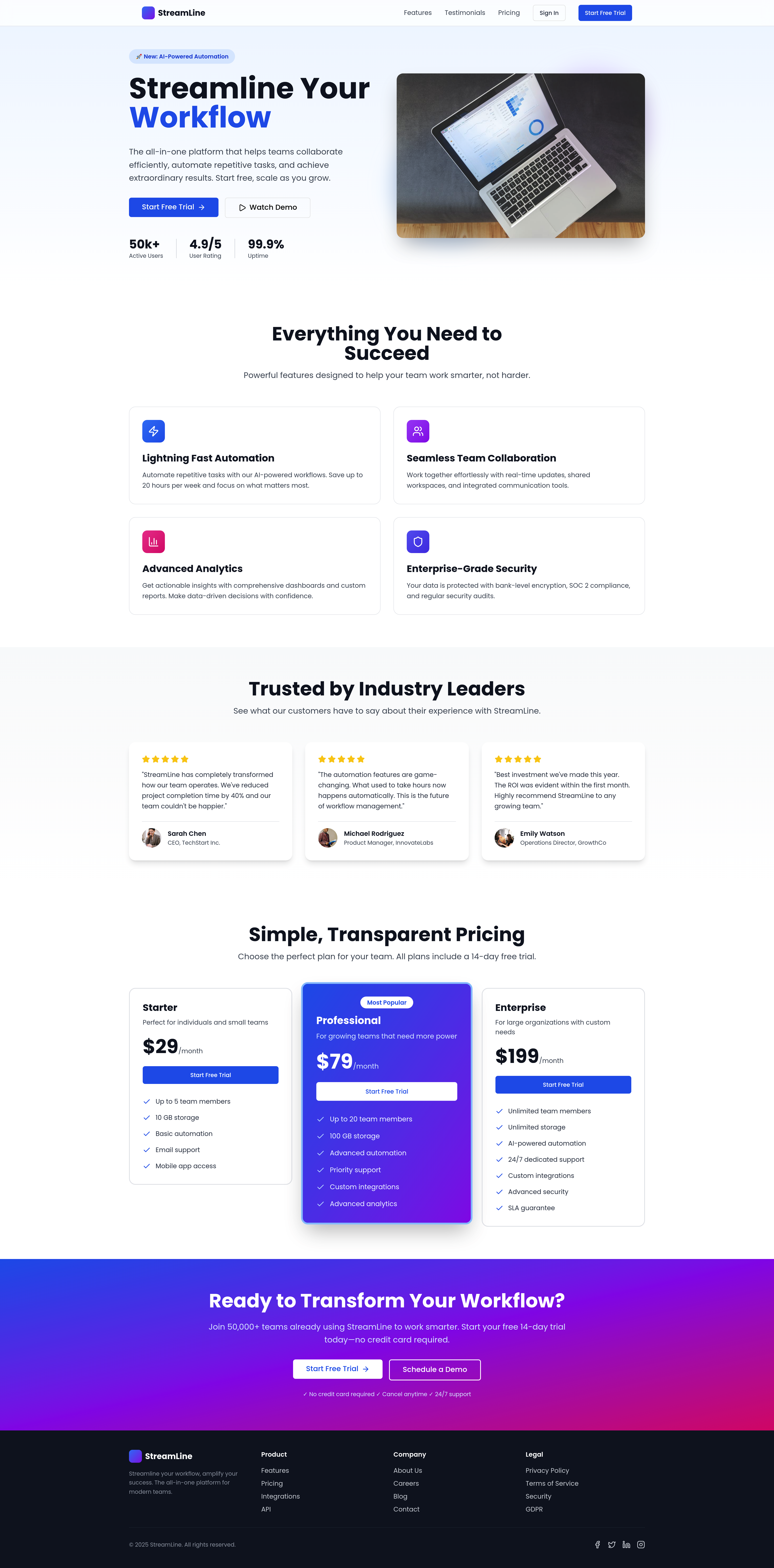 Discover StreamLine, a modern and responsive SaaS landing page template designed to convert visitors into customers. Featuring a compelling hero section, clear feature highlights, customer testimonials, flexible pricing plans, and prominent calls-to-action, this template is perfect for showcasing your software as a service product and driving sign-ups. Optimize your online presence with this SEO-friendly and engaging web solution.