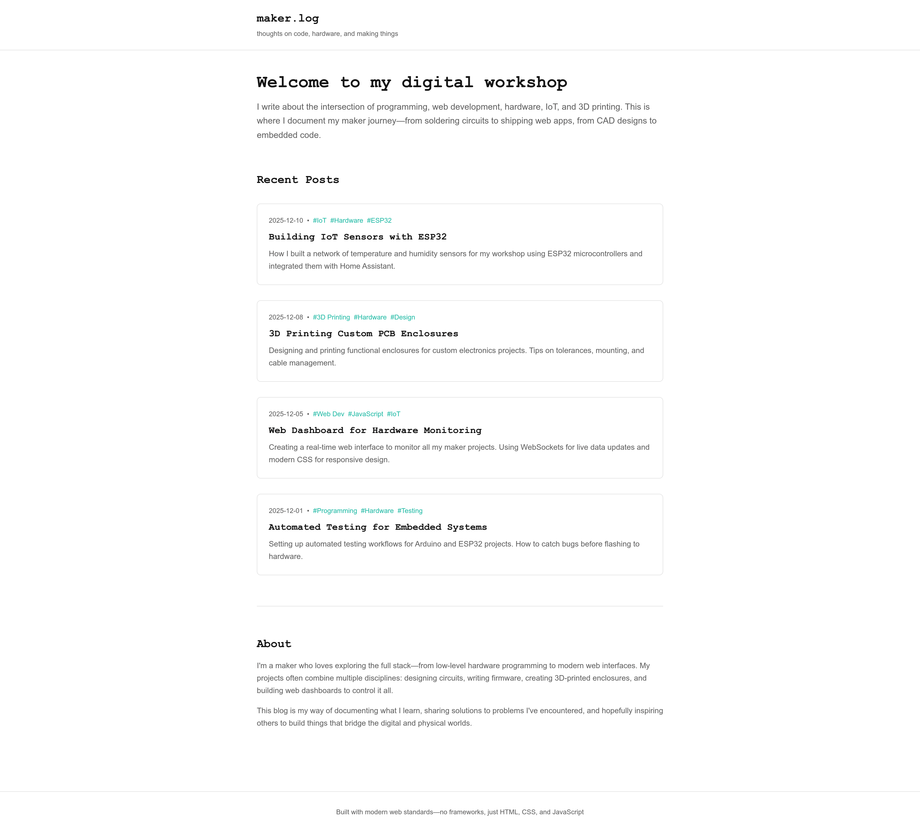 Explore a minimalist personal blog crafted with plain HTML, CSS, and JavaScript, focusing on modern web standards. This blog serves as a digital journal for a maker enthusiast, sharing insights and ideas on programming, web development, hardware, IoT, and 3D printing, and their fascinating intersections.