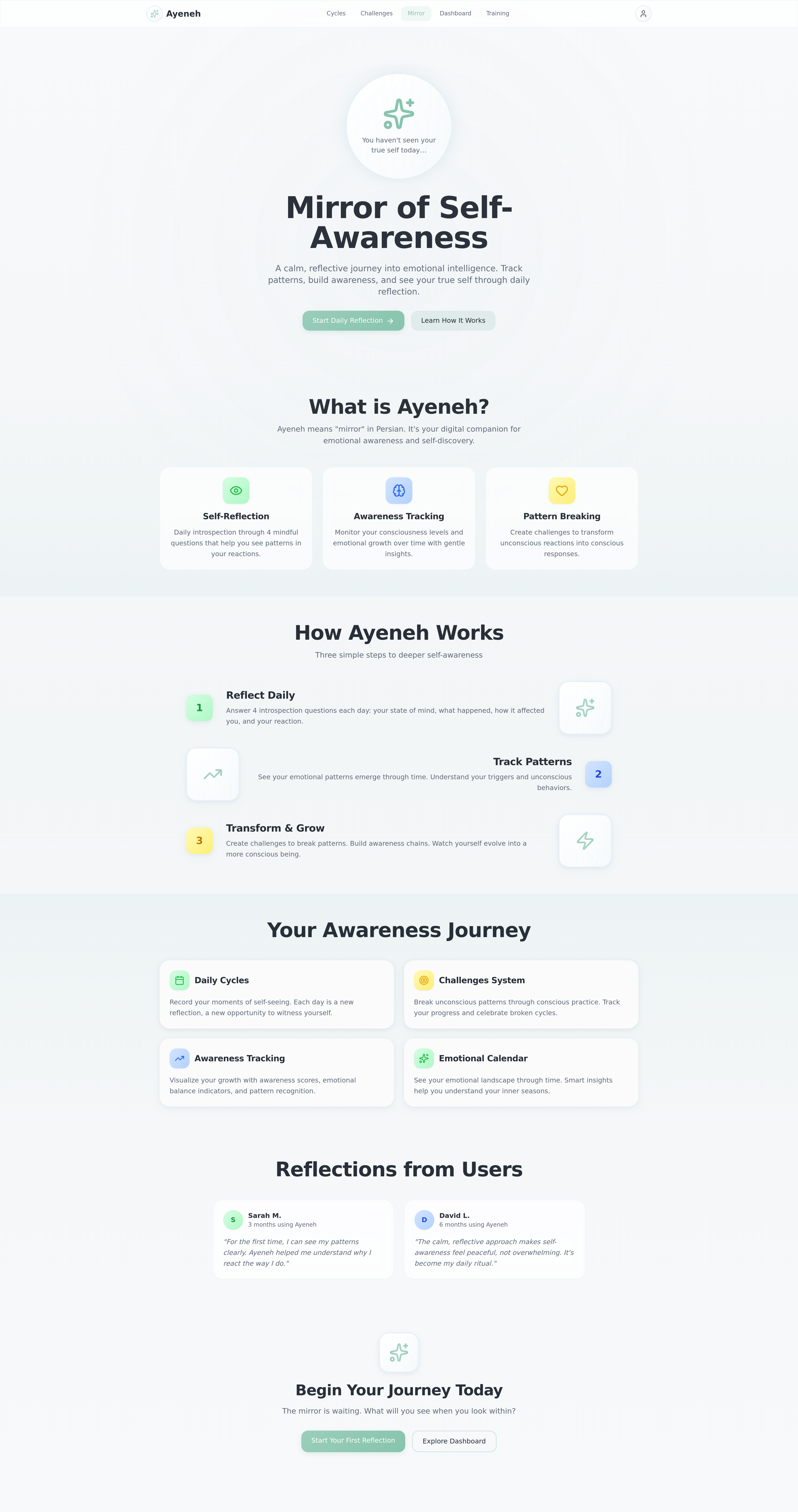 Explore Ayeneh, a self-awareness and emotional insight platform designed with a serene, misty-white aesthetic. This website features interactive tools like a daily reflection system, awareness tracking, and emotional balance indicators, all presented with soft 3D elements and mirror-inspired UI. Discover a calm, reflective space for personal growth and emotional well-being.