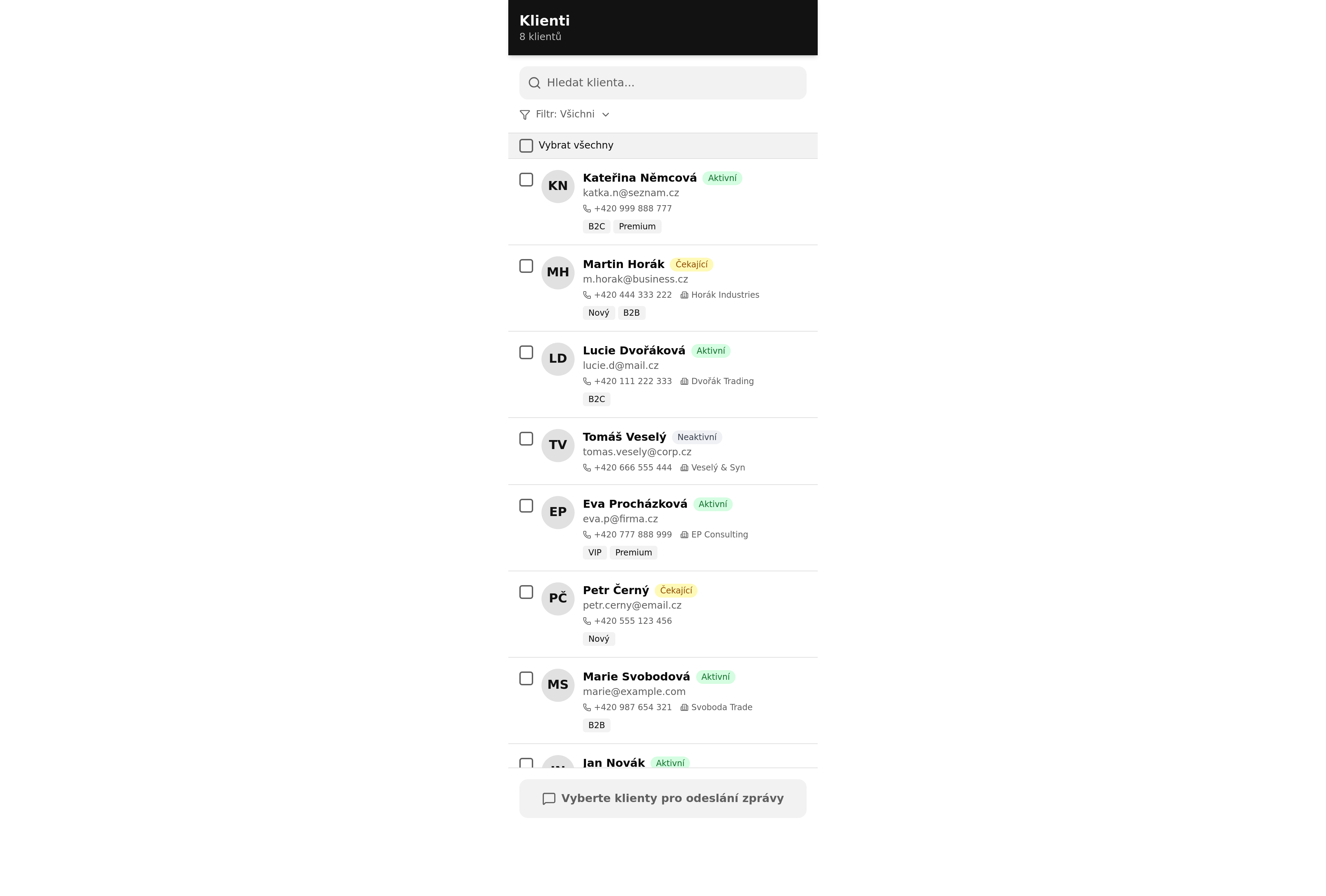Create a mobile app landing page featuring a client list, robust filtering options, and a direct message sending function. This marketing site is designed for businesses to showcase their app and connect with users efficiently.