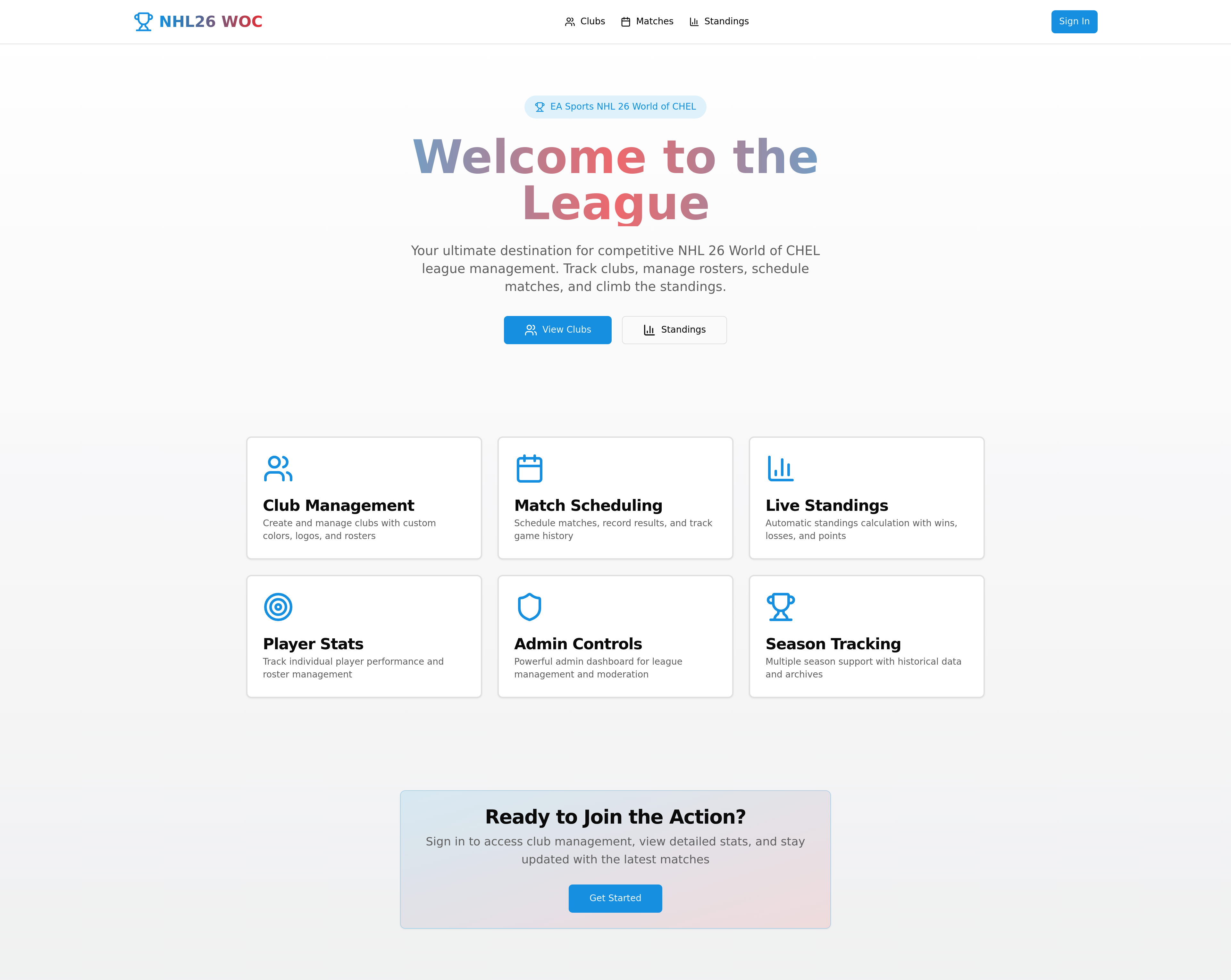 Create a dynamic web platform for EA NHL26 World of Chel (WOC) leagues. This comprehensive website solution supports full league management with dedicated sections for admins, clubs, match scheduling, team rosters, and real-time standings. Perfect for esports organizers and gaming communities looking to streamline their NHL26 WOC league operations and enhance player engagement.