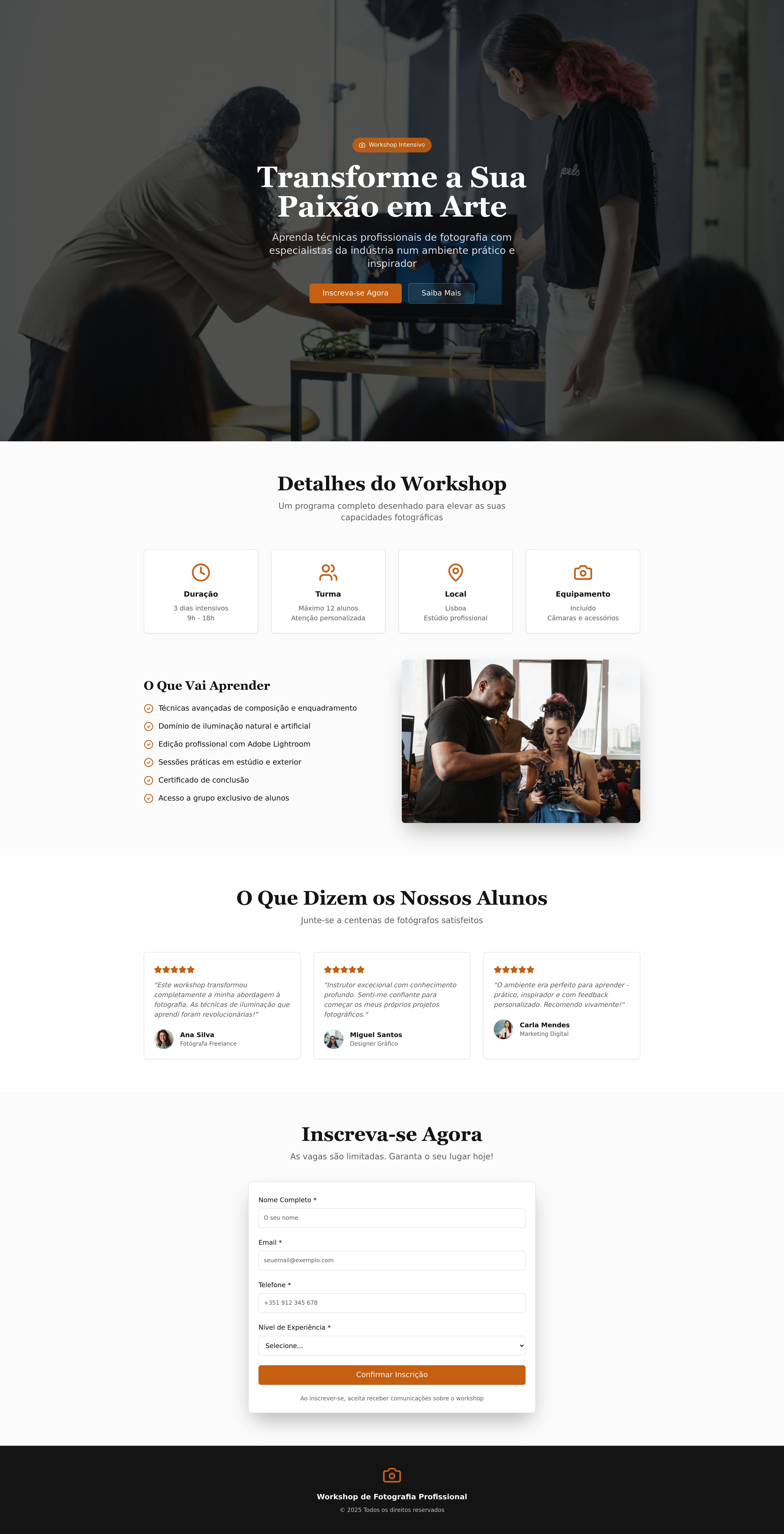 Create a high-converting landing page for a photography workshop. This SEO-optimized landing page features a prominent registration form, compelling testimonials section, and clear calls-to-action to drive sign-ups. Perfect for photographers and educators looking to promote their workshops and capture leads effectively.
