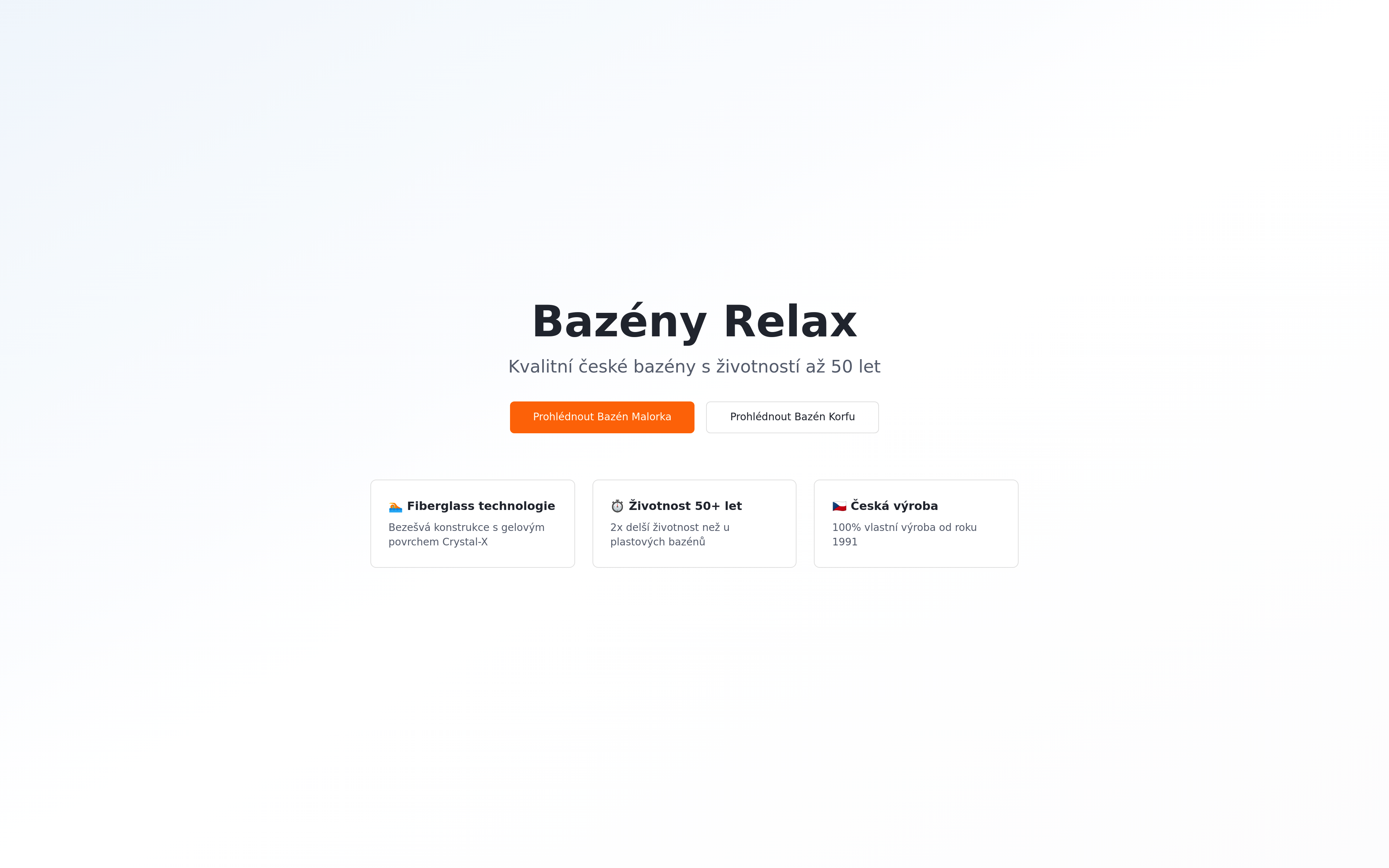 An enhanced product detail page (PDP) for Bazény Relax fiberglass pools, focusing on clear presentation of pool models like Malorka, Korfu, Havai, and Korsika. This mobile-first design emphasizes durable fiberglass construction, easy maintenance, and quick installation, guiding users to request a free quote. Features include detailed technical parameters, showroom information, material benefits, roofing options, accessories, installation guides, and a contact form, all while maintaining the existing brand identity and visual style.