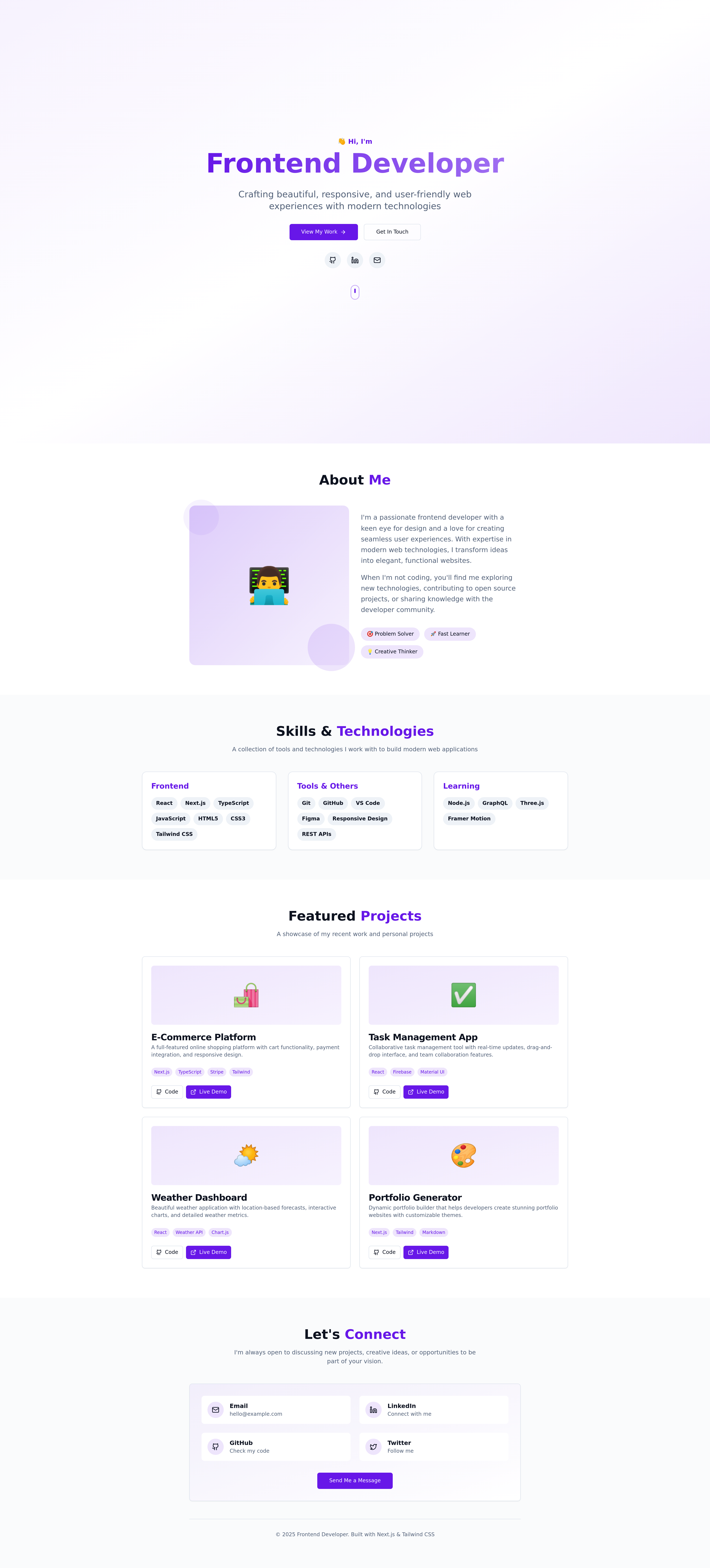 Showcase your frontend development expertise with this sleek, responsive portfolio website. Featuring sections for projects, skills, and contact information, it's designed to help developers highlight their work and attract potential employers or clients. Perfect for demonstrating UI/UX skills and custom web development.