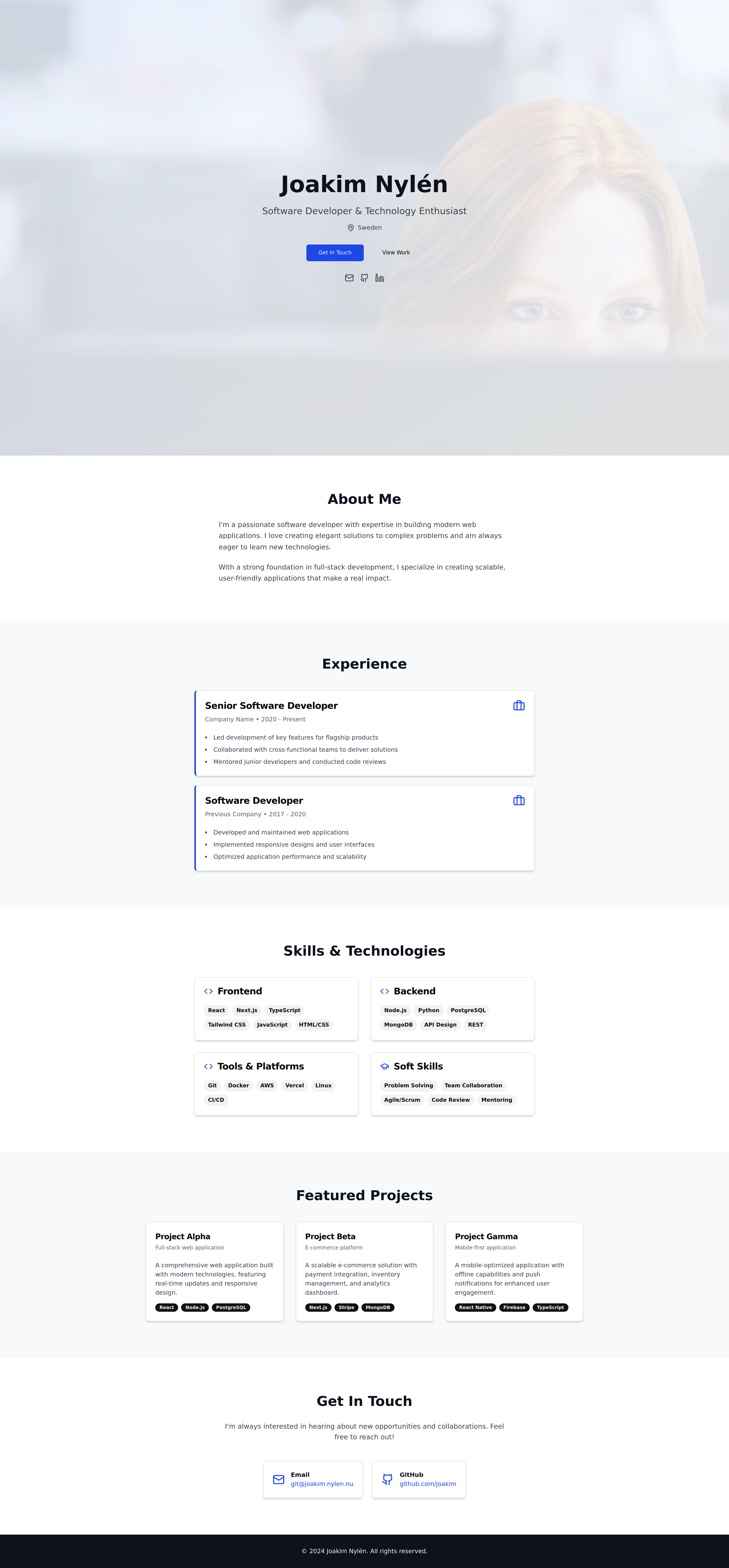 Showcase your professional journey with a sleek, modern portfolio website. This template is designed for consultants, freelancers, and job seekers like Joakim Nylen, featuring sections for experience, education, skills, and contact information. Easily customizable to highlight your unique professional brand and attract potential employers or clients.