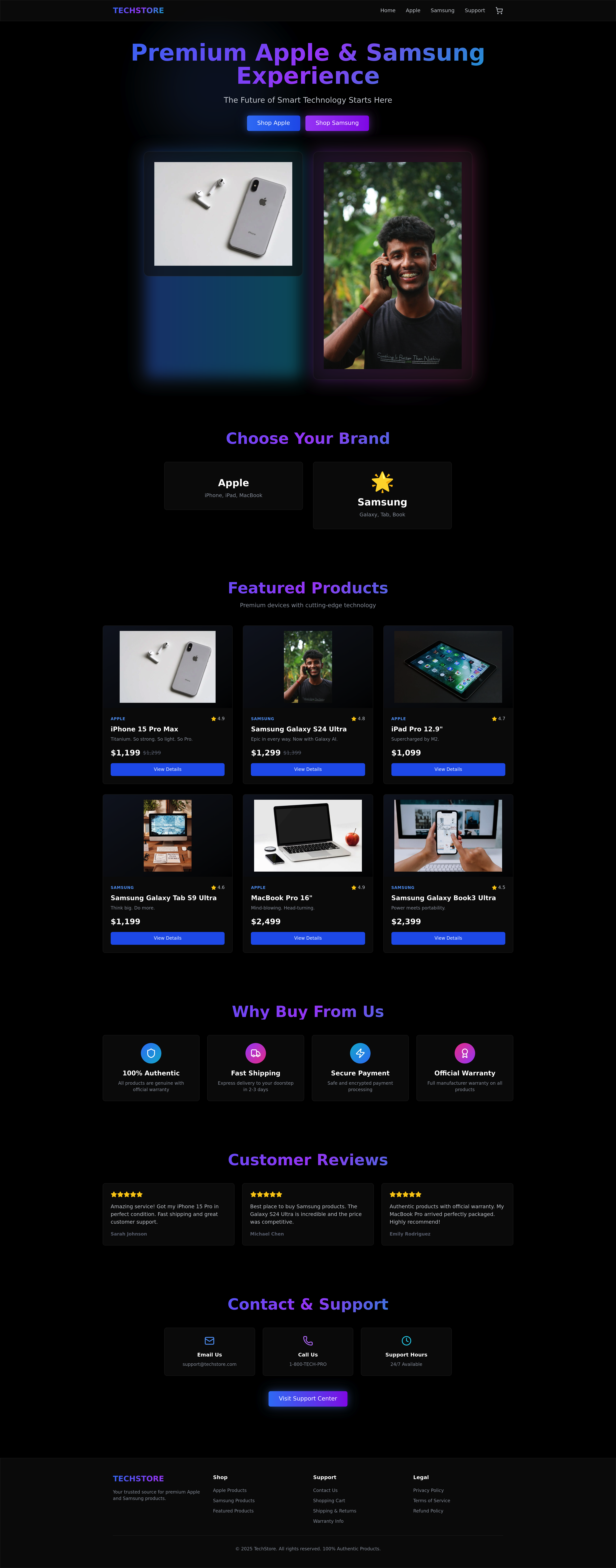 Explore a premium dark-mode e-commerce website designed for Apple and Samsung products. This futuristic online store offers a luxurious shopping experience with cinematic product showcases, secure checkout, and essential features like product detail pages, shopping cart, and customer support. Discover the latest iPhones, Galaxy devices, iPads, MacBooks, and more, all presented with a sleek cyberpunk aesthetic and glassmorphism UI. Optimized for SEO and mobile responsiveness, this platform provides a seamless way to buy authentic smart technology.