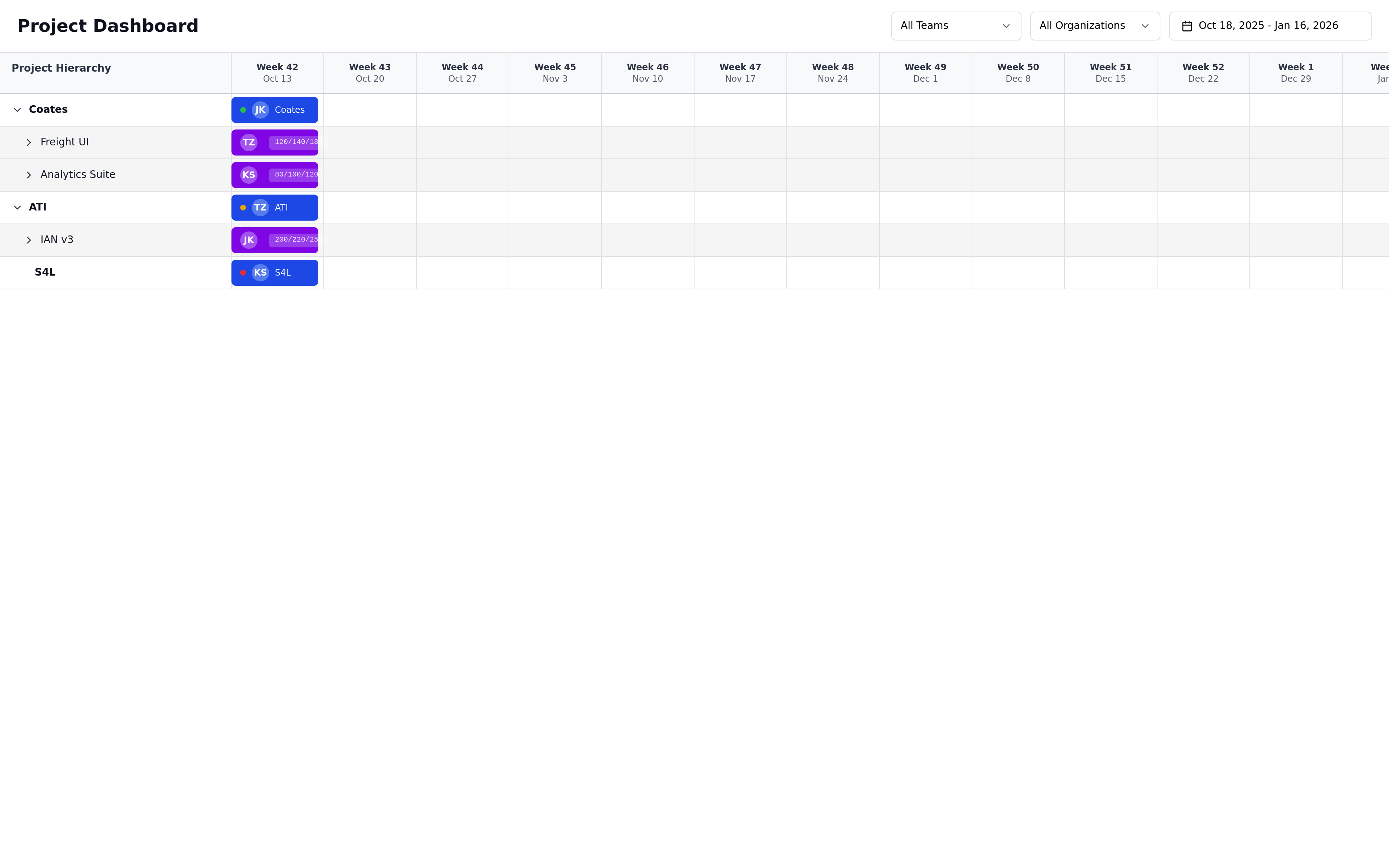 Create a modern enterprise project management dashboard with a pivot Gantt chart. This web application features hierarchical project views (Organization, Deal, Epic, Story), dynamic filtering by Team and Organization, and a date picker for flexible reporting. Visualize project status with color-coded mood indicators, owner initials, and detailed budget triplets (billed, estimated, remaining hours). The interactive Gantt timeline displays project start and end dates aligned with weekly columns, perfect for tracking progress and resource allocation in a clean, intuitive interface.