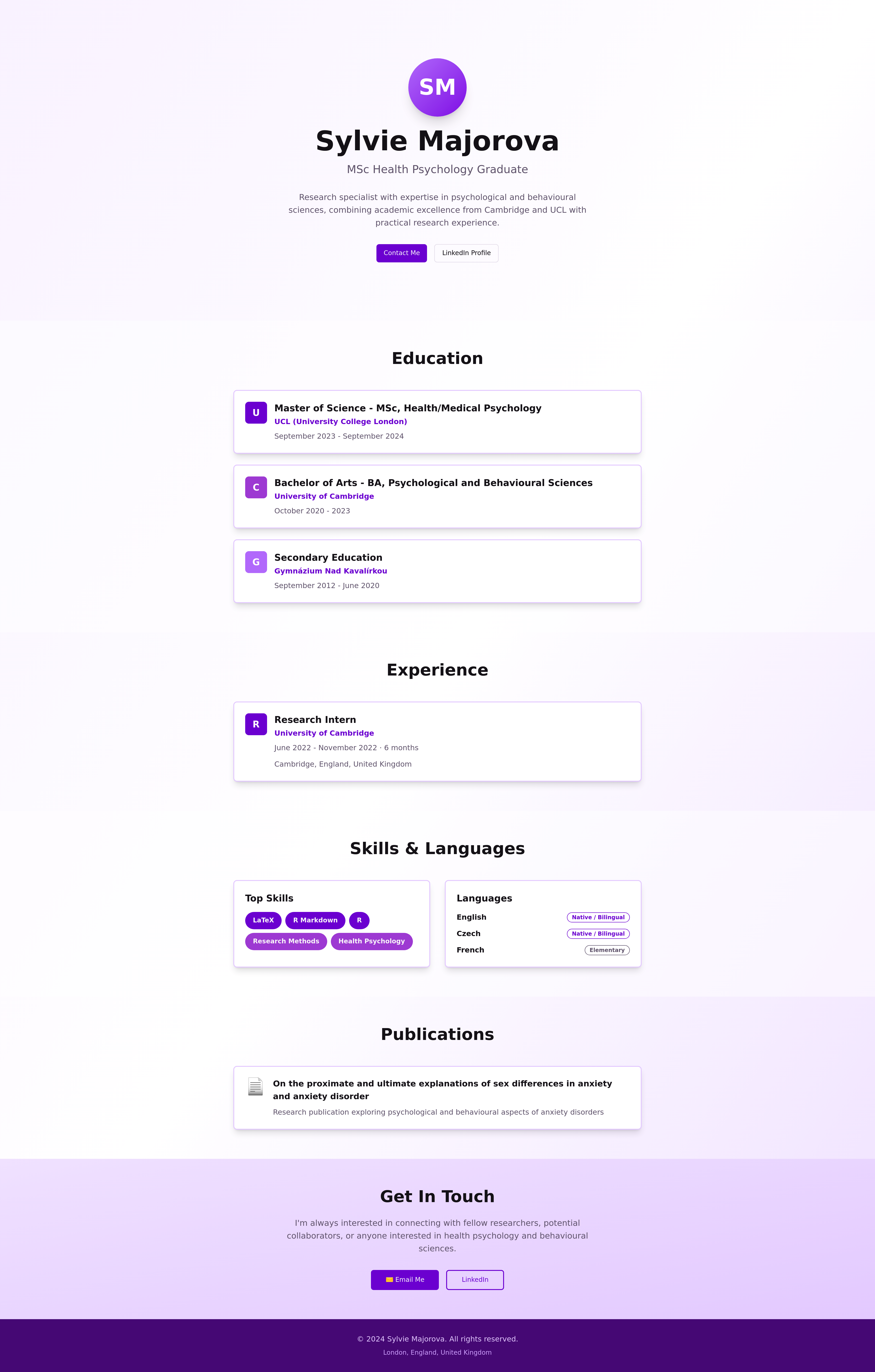 Create a stunning, personalized purple portfolio website to showcase your professional profile, projects, and achievements. This elegant personal site is perfect for freelancers, artists, and professionals looking to establish a strong online presence and attract new opportunities. Features include customizable sections for your bio, work samples, contact information, and more, all designed with a cohesive purple aesthetic.