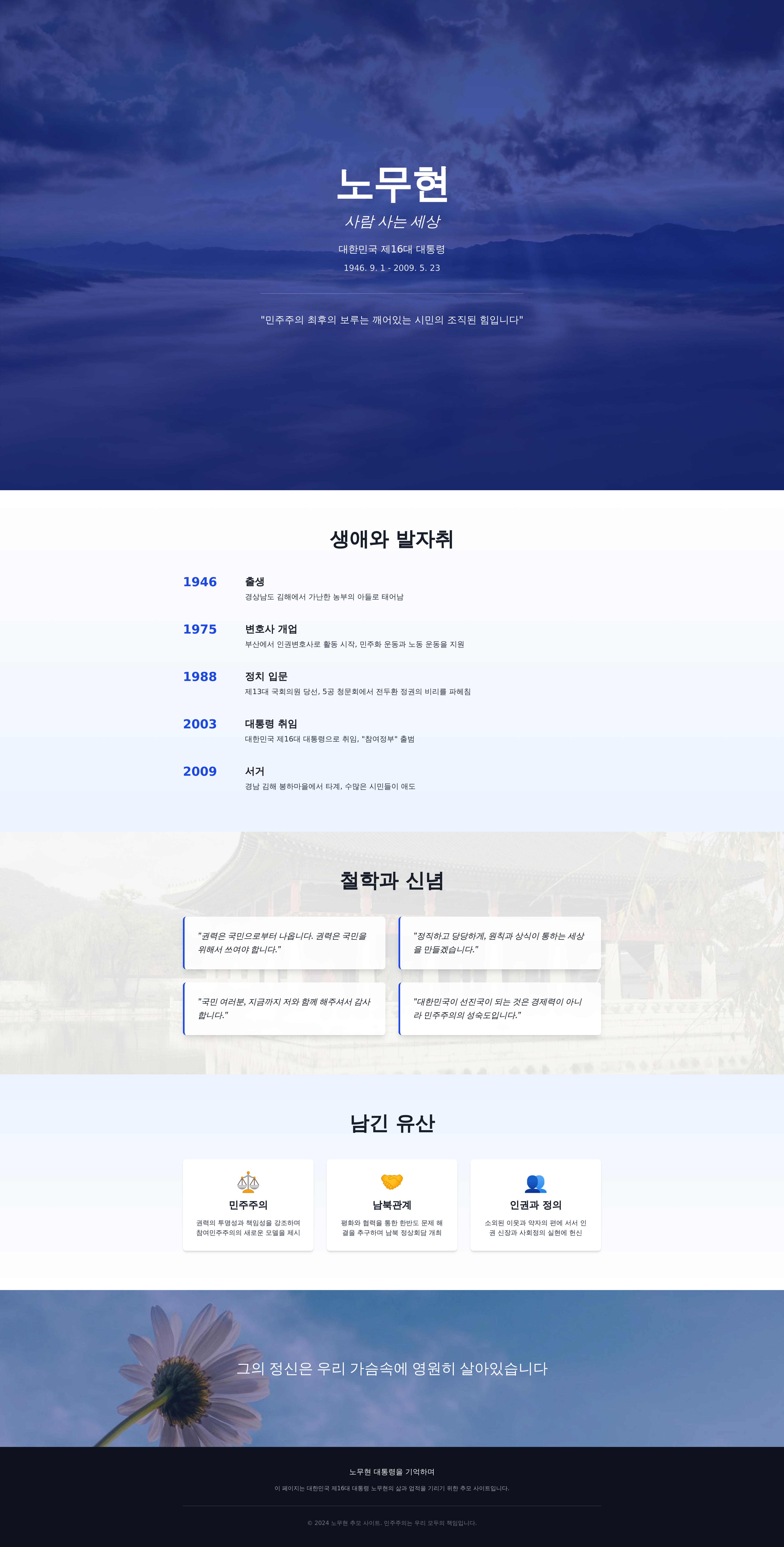 A memorial website dedicated to former South Korean President Roh Moo-hyun, featuring his biography, key policies, speeches, and a photo gallery. This platform serves as an archive and tribute to his legacy, offering insights into his political career and contributions to democracy.