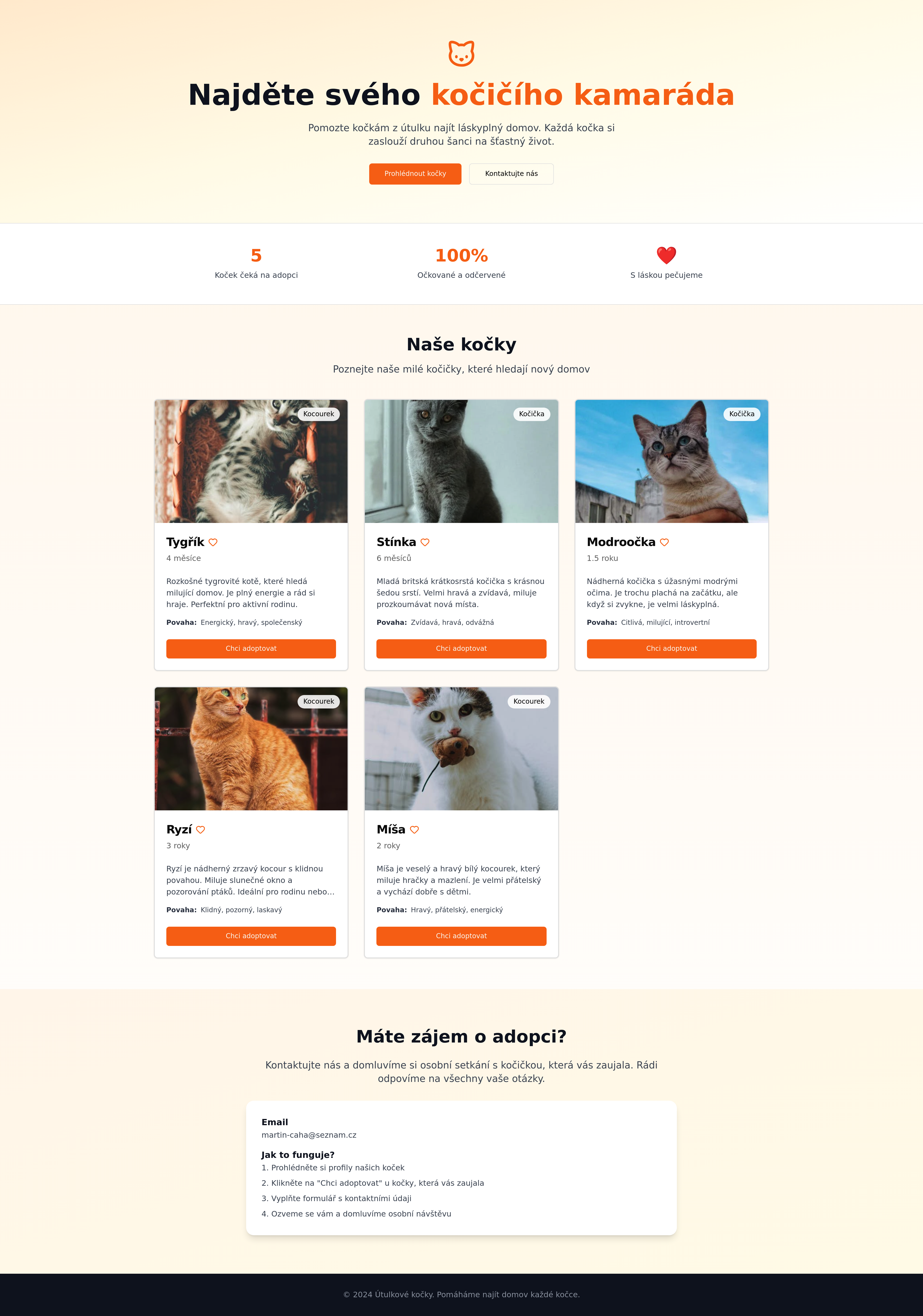 Vytvořte webové stránky pro útulek, které usnadní adopci koček. Stránky budou obsahovat profily koček s fotografiemi, popisy a informacemi o jejich povaze. Návštěvníci budou moci procházet kočky, filtrovat je podle různých kritérií a vyplnit online formulář pro adopci. Cílem je propojit opuštěné kočky s milujícími domovy a zvýšit povědomí o adopci zvířat.