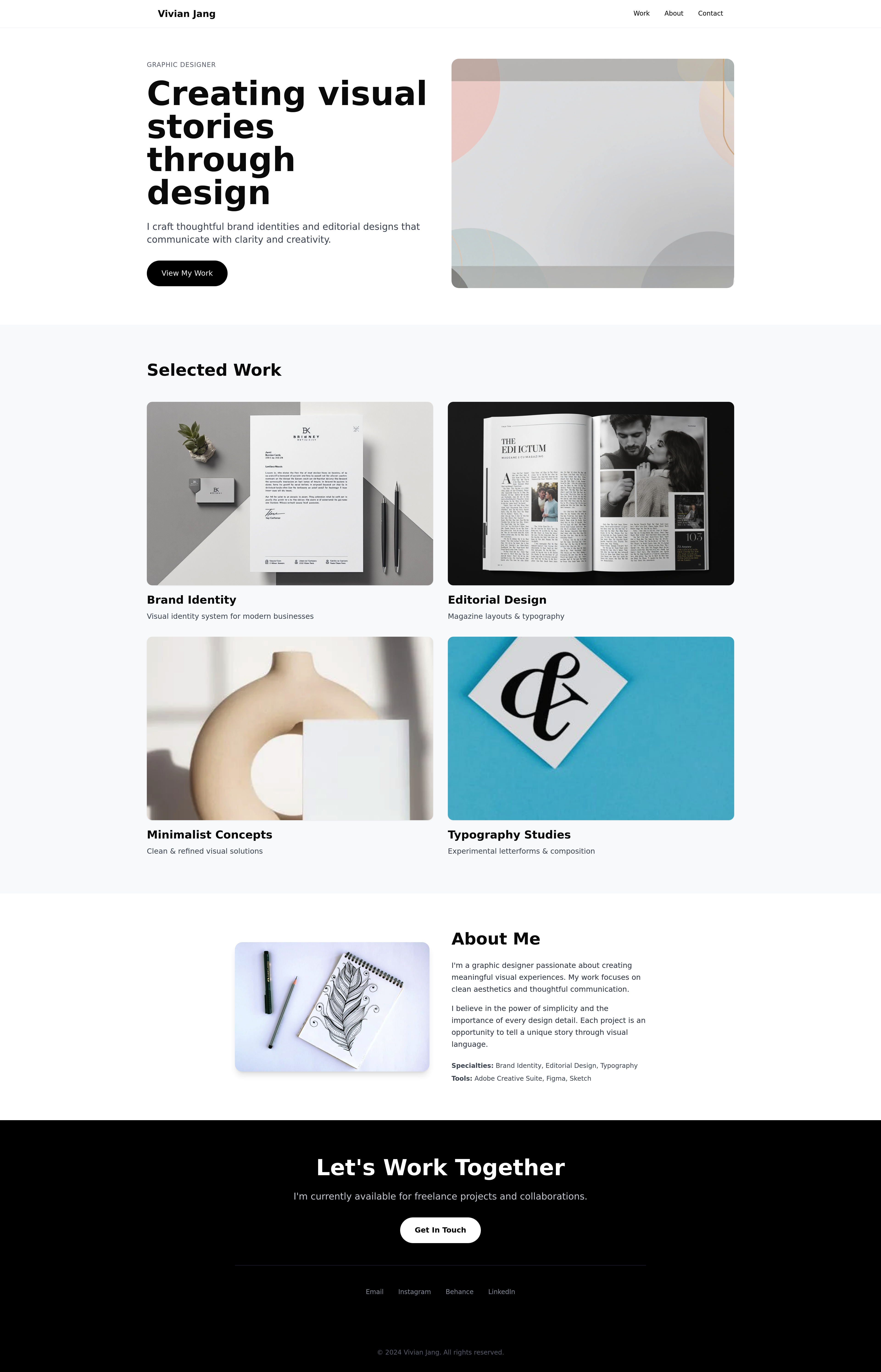 A sleek and modern online portfolio for graphic designers to showcase their work. This website provides an elegant platform for visual artists to present their design projects, even with a limited number of pieces, to potential clients and employers. Features include a customizable gallery, contact form, and an