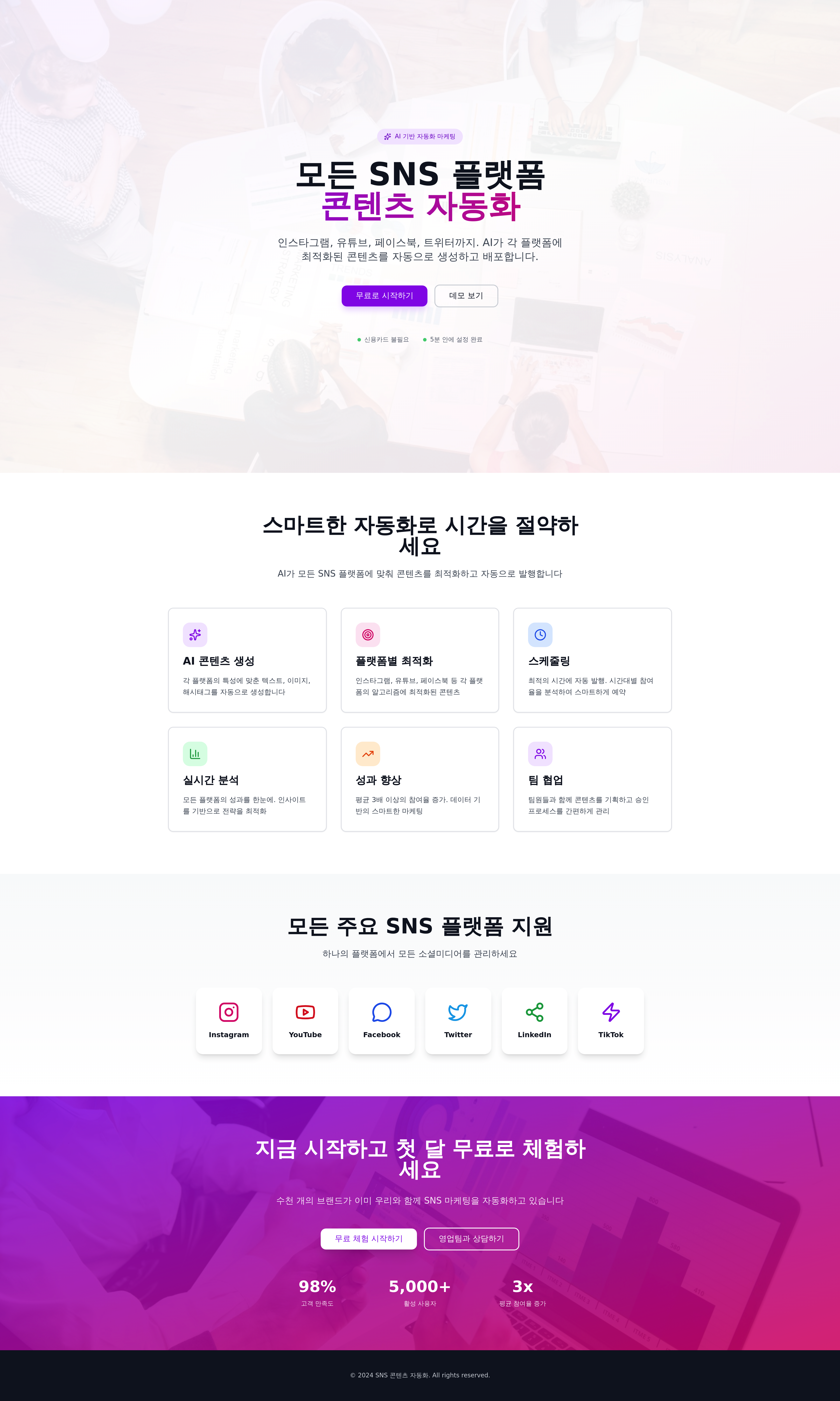 Automated social media marketing platform designed for optimal content delivery across all SNS platforms. Boost your online presence with AI-powered content automation, scheduling, and analytics for Facebook, Instagram, Twitter, and more. Perfect for businesses, marketers, and influencers looking to streamline their social media strategy and maximize engagement.