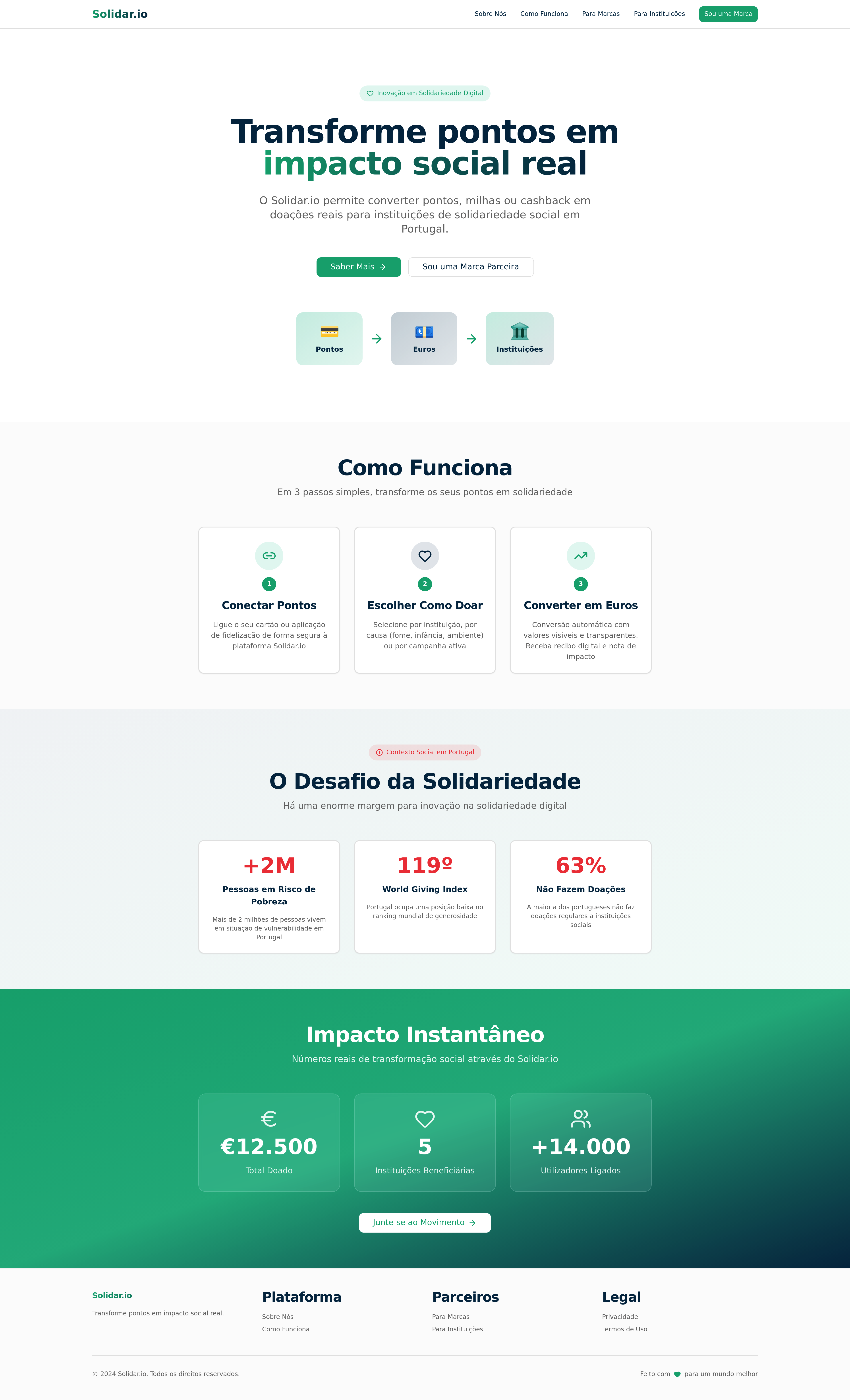 Solidar.io is an innovative web platform designed to transform loyalty program points, miles, and cashback into real monetary donations for social solidarity institutions. This professional and minimalist website prototype showcases a seamless process for users to connect their loyalty accounts, choose causes or specific institutions, and convert points into impactful donations. For brands, Solidar.io offers robust ESG reporting, enhanced customer loyalty, and competitive differentiation through a dedicated partner portal and comprehensive dashboard for tracking social impact and consumer engagement. Explore this modern, tech-for-good solution for digital solidarity.