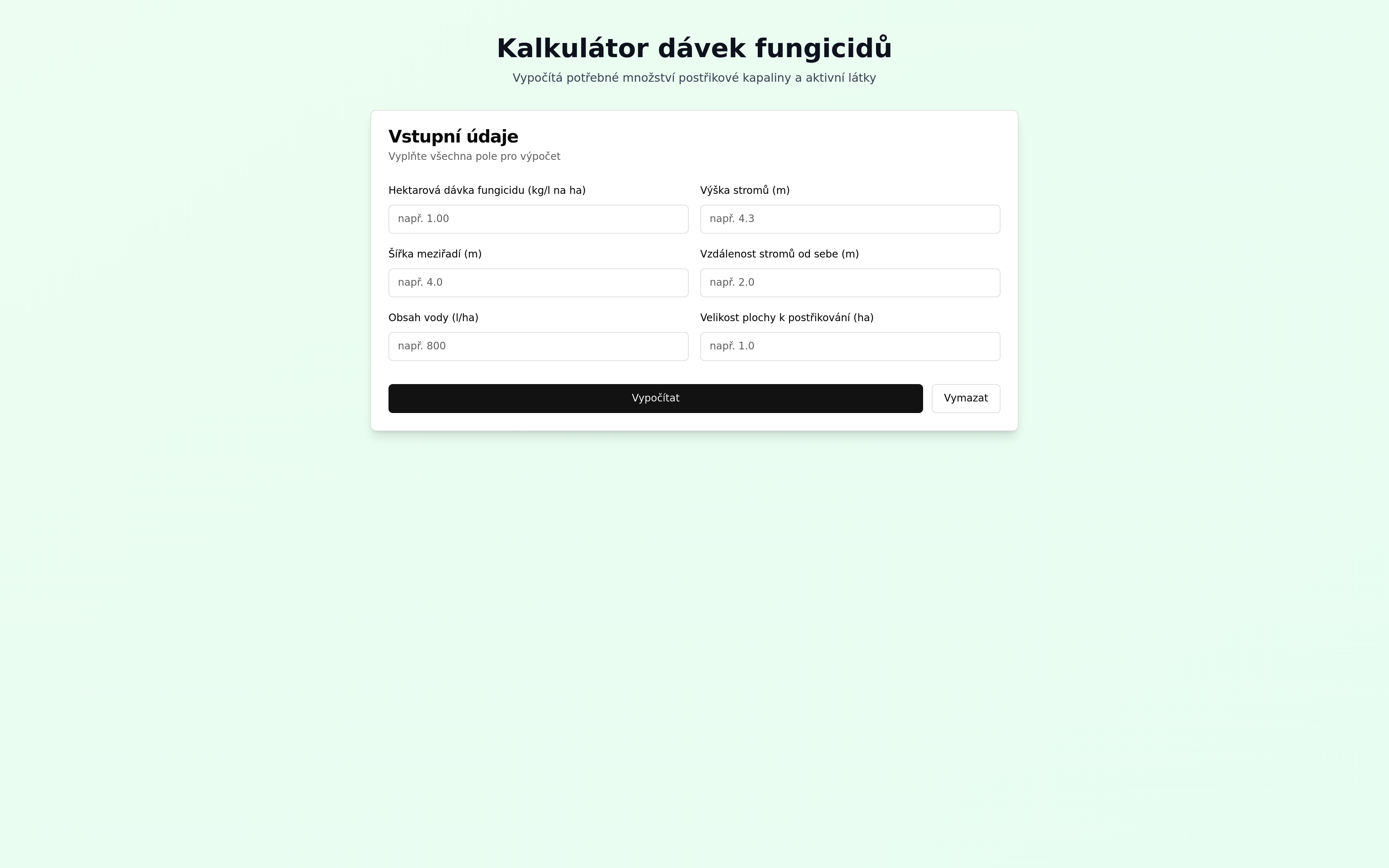 A web-based agricultural calculator designed for farmers and agronomists to accurately determine the required amount of spray mixture and pesticides (fungicides, insecticides) for experimental plots. This tool calculates precise dosages based on plot size, hectare dosage, tree height, row spacing, tree distance, and water volume per hectare, optimizing agricultural treatments and resource management.