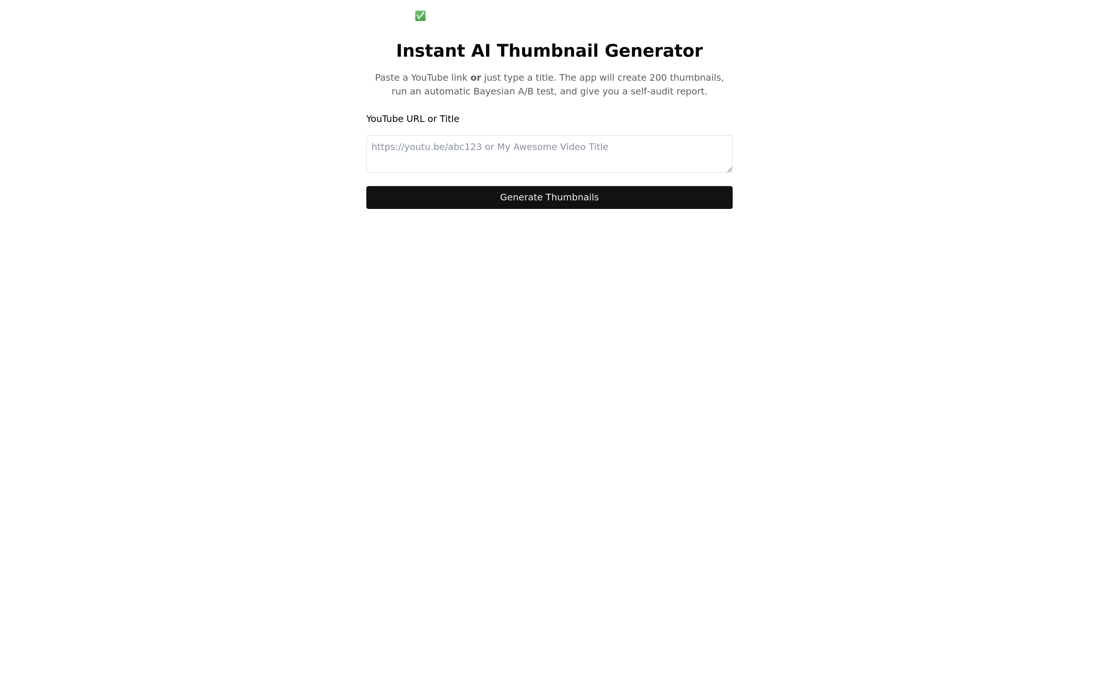 Generate and A/B test YouTube thumbnails with AI. This tool creates 200 unique AI-generated thumbnail PNGs from a YouTube URL or video title, automatically A/B tests them using a Bayesian bandit, and provides the winning thumbnail URL for easy copying. Perfect for content creators seeking optimized video performance.