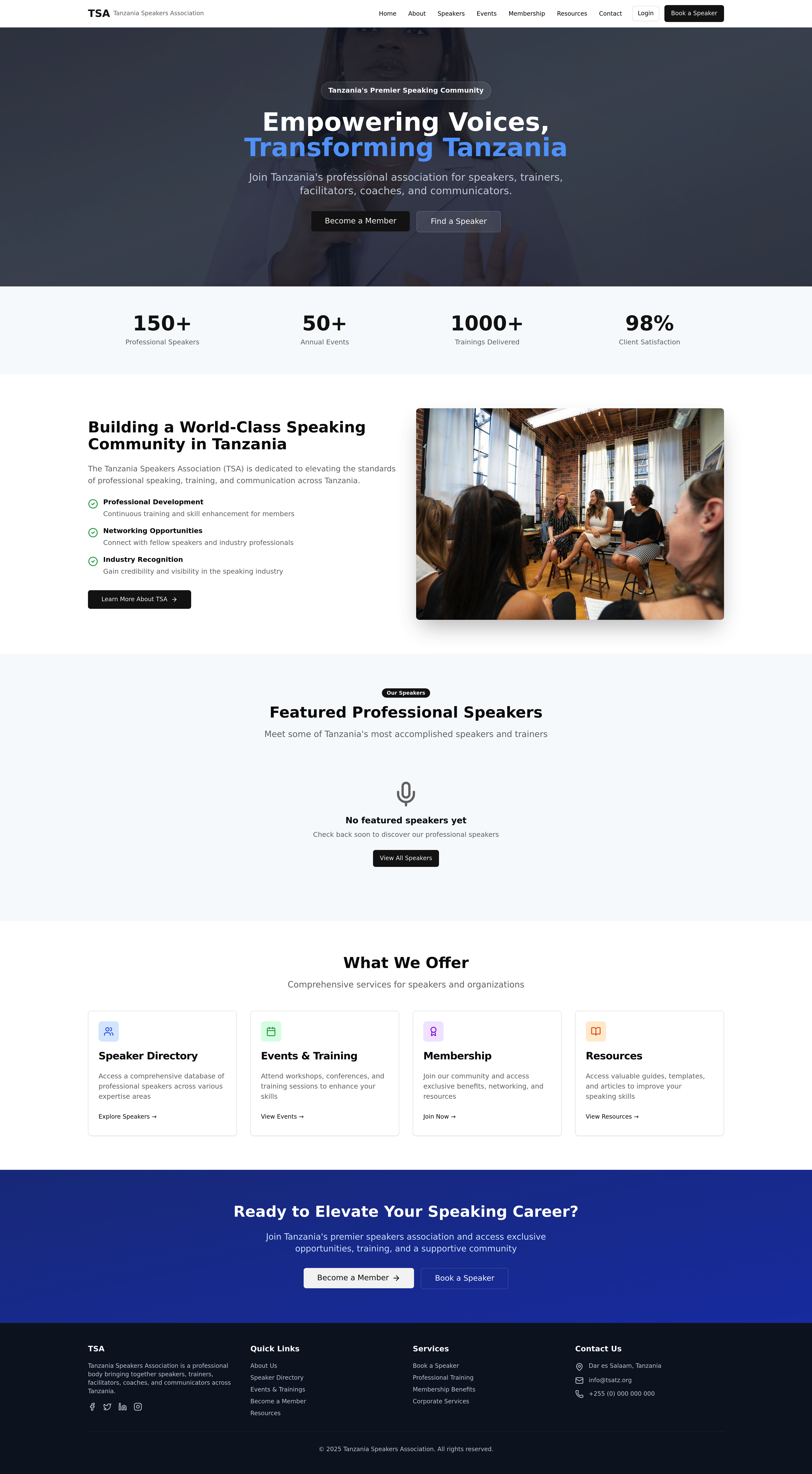 Explore the Tanzania Speakers Association (TSA) website, a professional platform connecting speakers, trainers, and communicators across Tanzania. This business website features a searchable speaker directory, online membership registration and payment, event management, and a resource center. Discover professional speakers, join the association, and access valuable resources for public speaking and training.