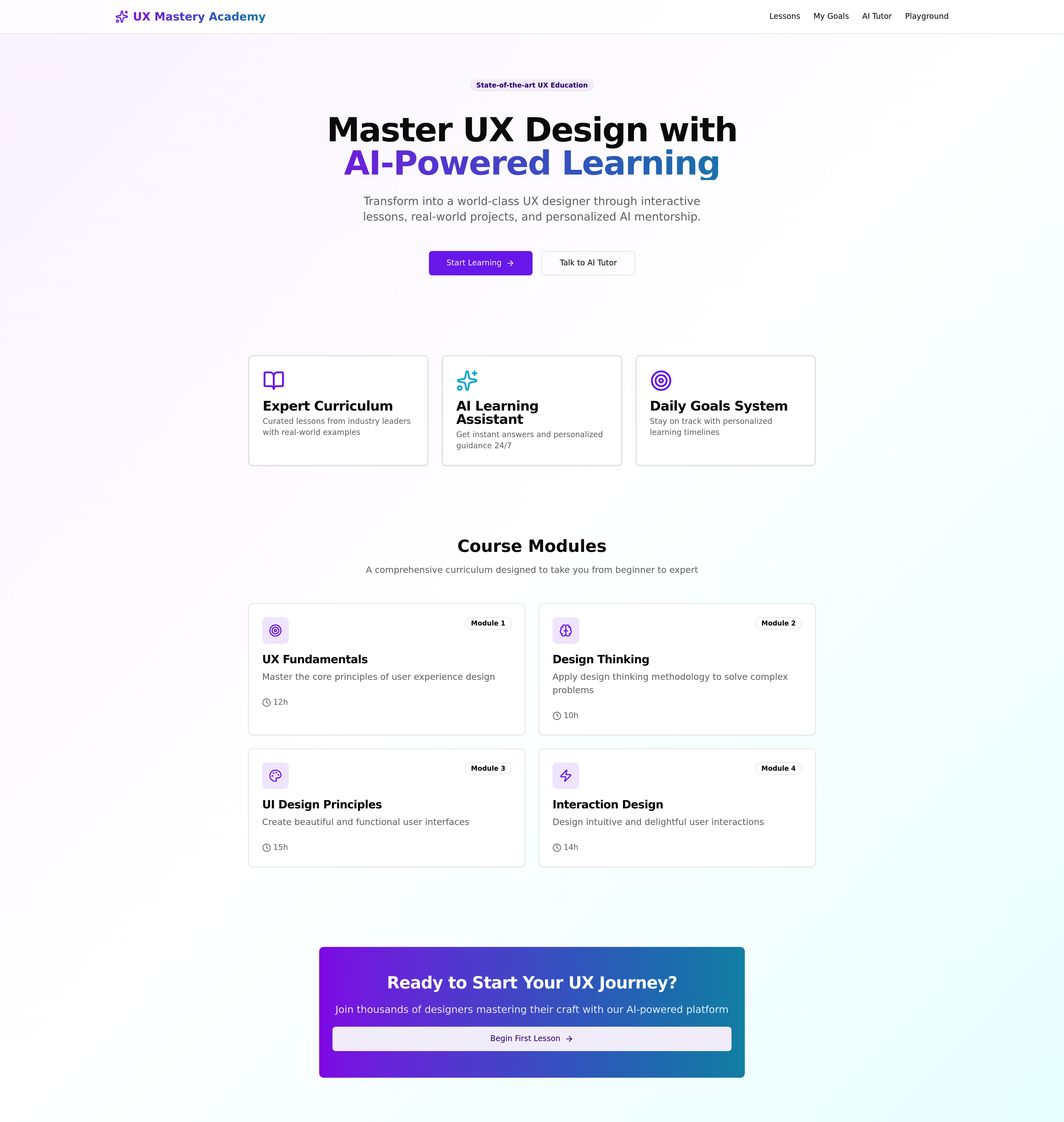 Unlock your potential with an AI-powered UX Masterclass website. This platform offers state-of-the-art UX education through interactive AI chat-led classes, curated YouTube video tutorials, and practical scripting challenges. Featuring a daily goal timeline to track progress, this website is designed for aspiring UX designers seeking a creative and comprehensive learning experience.
