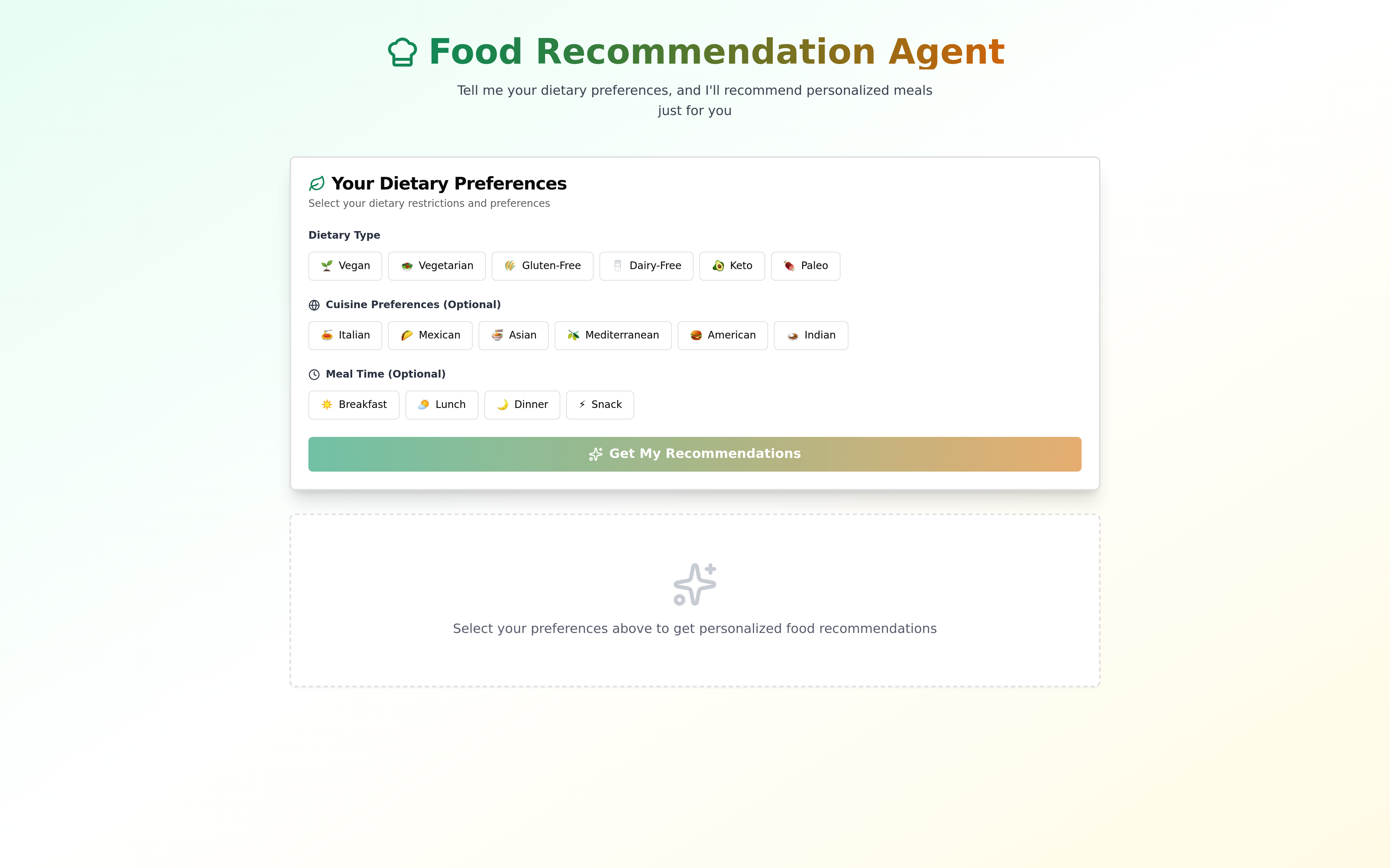 Explore a web-based, agentic-like simulation that provides personalized vegan food recommendations. This interactive tool helps users discover new plant-based dishes and meal ideas tailored to their dietary preferences, making healthy eating enjoyable and accessible.