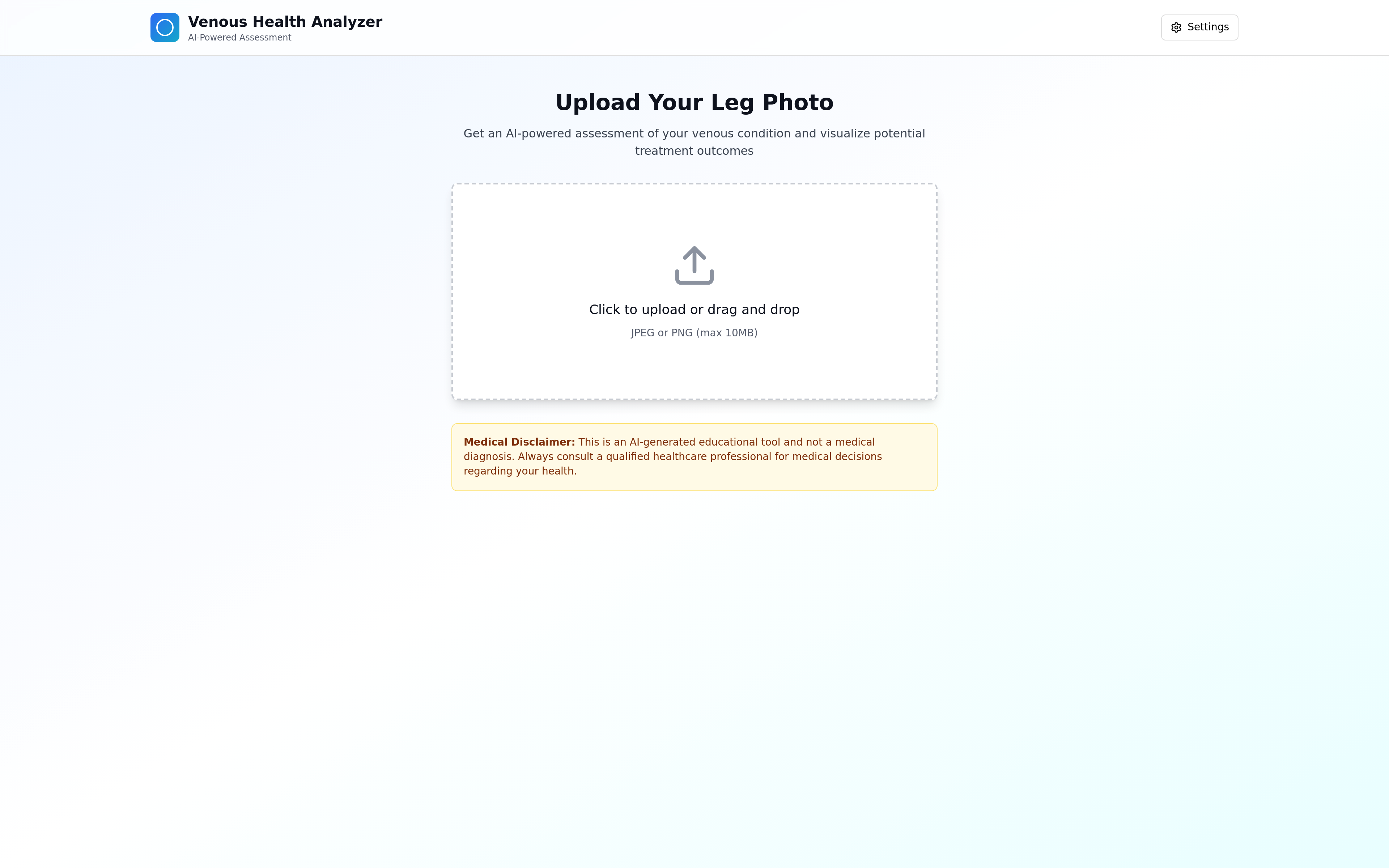 An AI-powered web application for individuals with venous issues to visualize potential treatment outcomes. Users can upload a leg photo, receive an AI-driven assessment based on GPT-5.1 and RAG documents, and simulate "After 4/8/12 weeks" treatment results using gpt-image-1. Features include secure API key management, RAG document uploads, customizable image generation prompts, and an interactive before/after comparison slider. This tool provides educational insights and visual comparisons, emphasizing it is not a medical diagnosis.