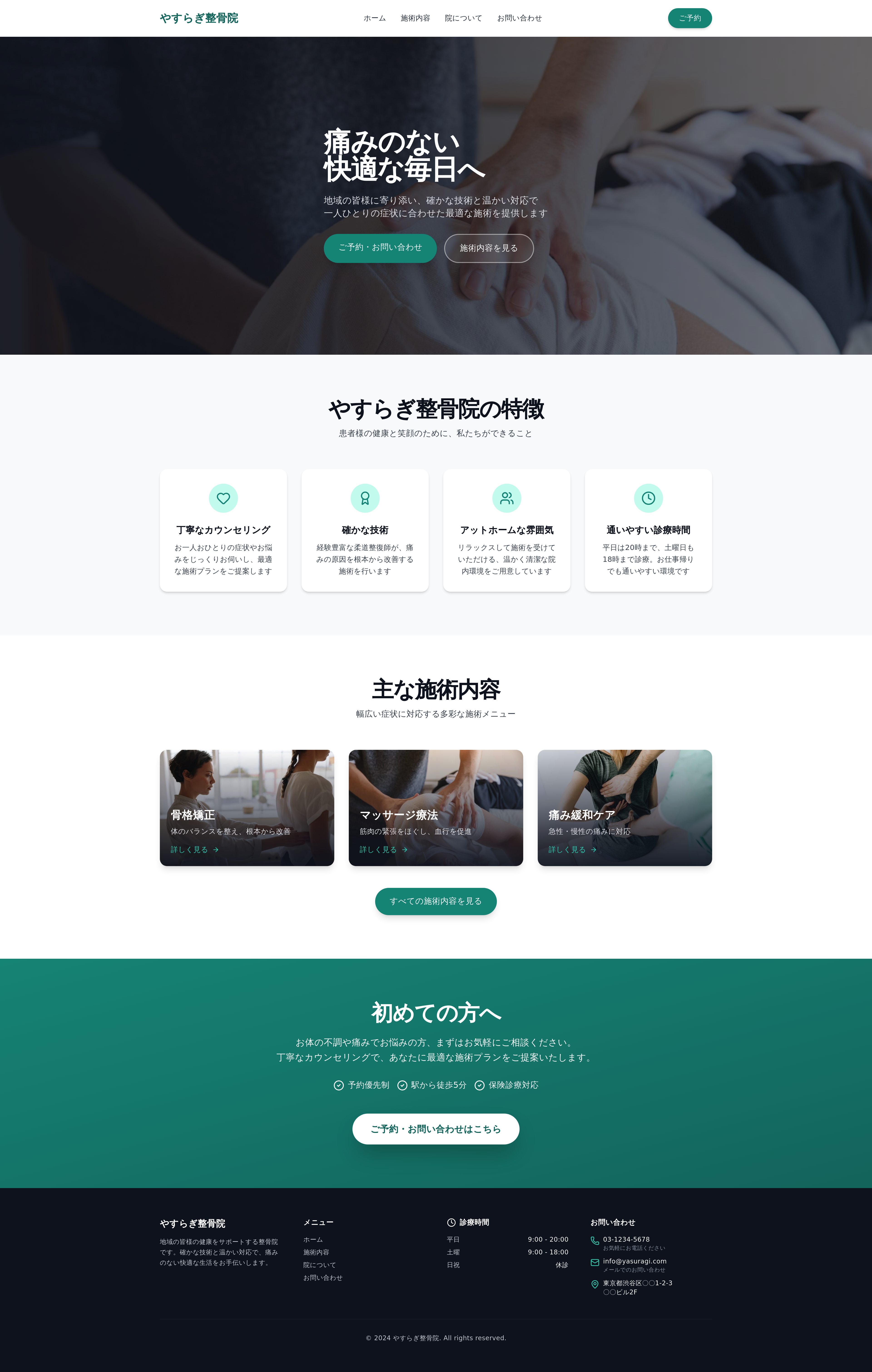 信頼感と暖かみを感じさせる整骨院の公式サイト。患者様が安心して来院できるよう、治療方針、施術内容、院内の雰囲気、スタッフ紹介などを分かりやすく紹介。地域に根ざしたサービスで、健康をサポートします。