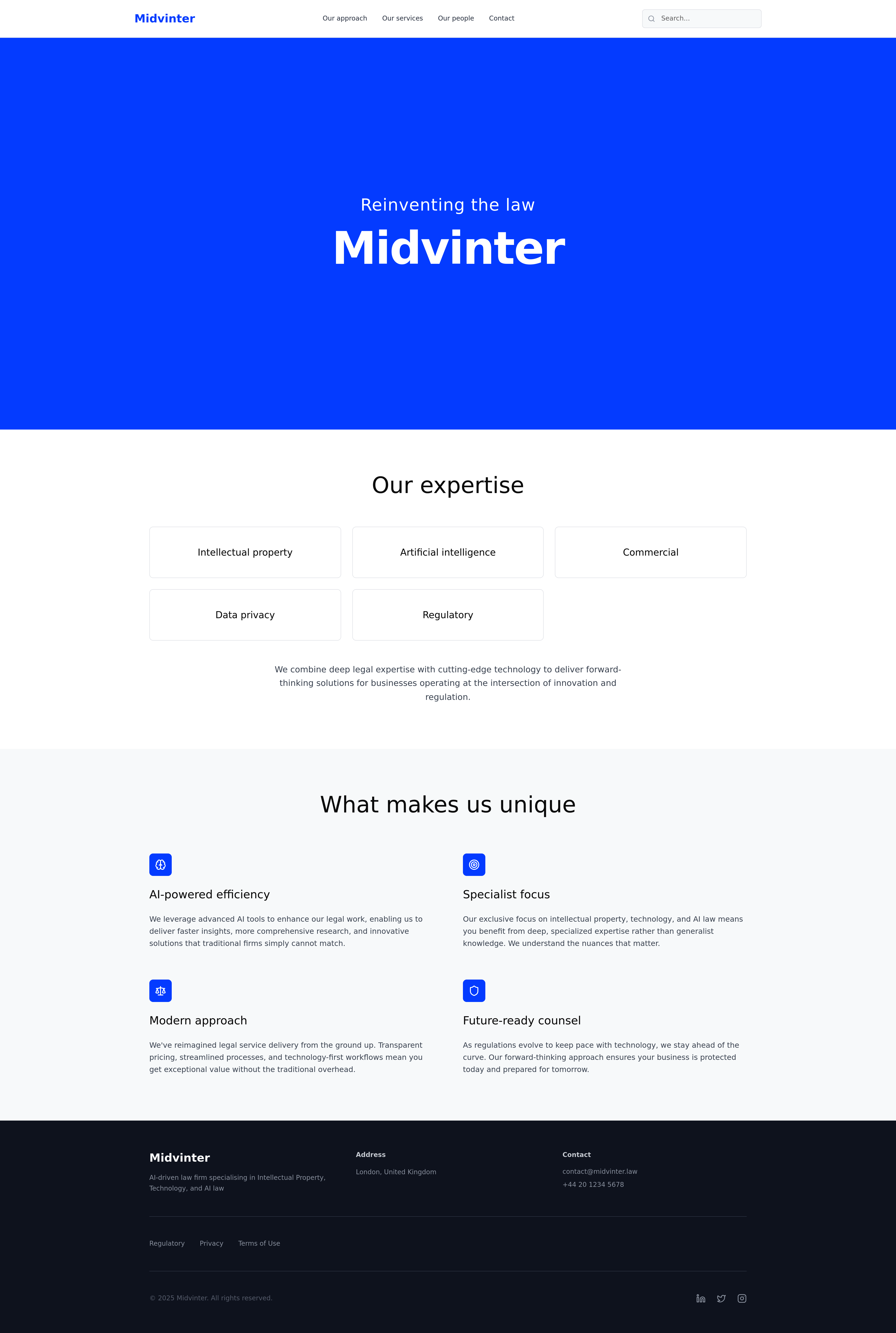 Midvinter: A premium, AI-driven law firm specializing in Intellectual Property, Technology, and AI Law. This modern business website features a clean, minimalist design, smooth animations, and a focus on user experience. Discover expert legal services, our unique approach, and a team dedicated to reinventing the law for the future.