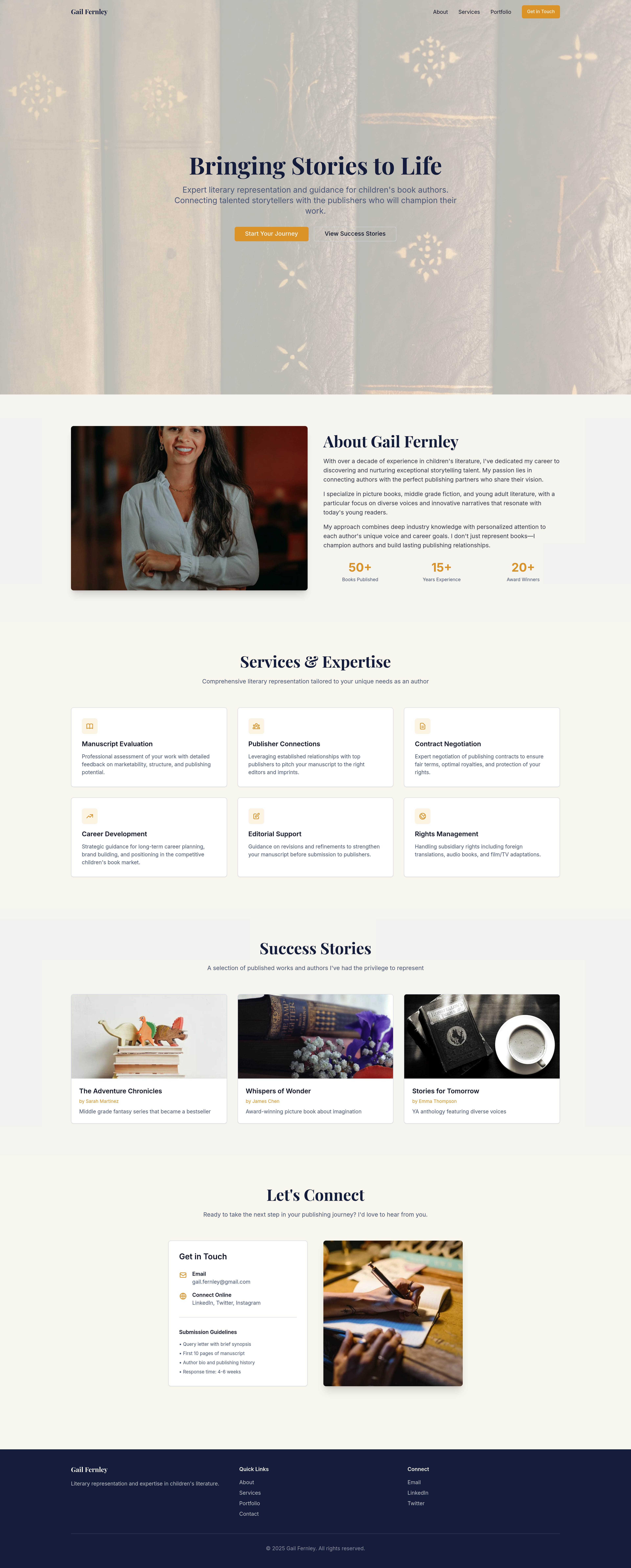 Create a professional online portfolio for children's book author agents. Showcase your background, skills, and successful projects with a sophisticated design that rivals major corporate websites. Attract new talent and publishing houses with a compelling digital presence.