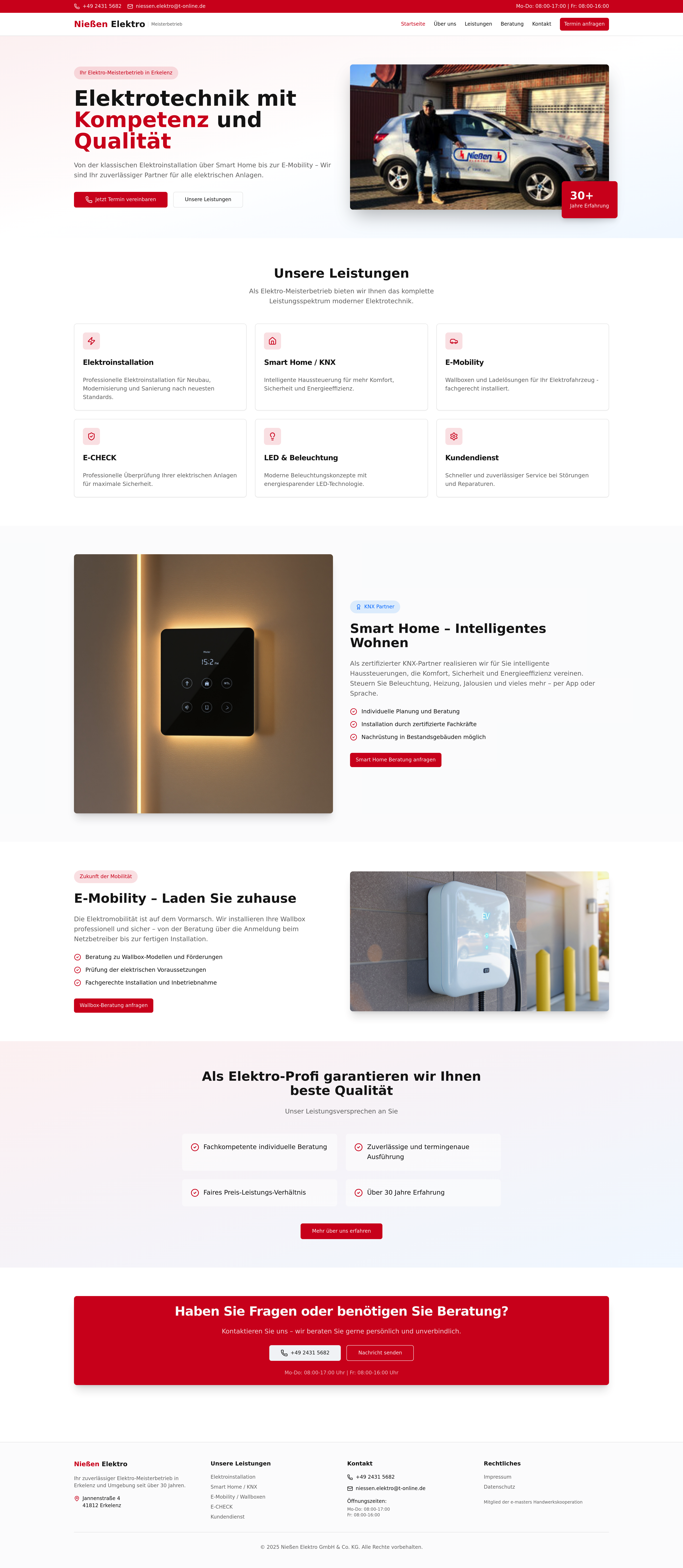 A modern, professional redesign of Niessen Elektro, an electrical services business website. This project focuses on creating a contemporary online presence with improved user experience, showcasing their services with an authentic design, and ensuring all links are functional. Features include a sleek layout, updated imagery, and clear calls to action for electrical installation, smart home solutions, and energy efficiency.