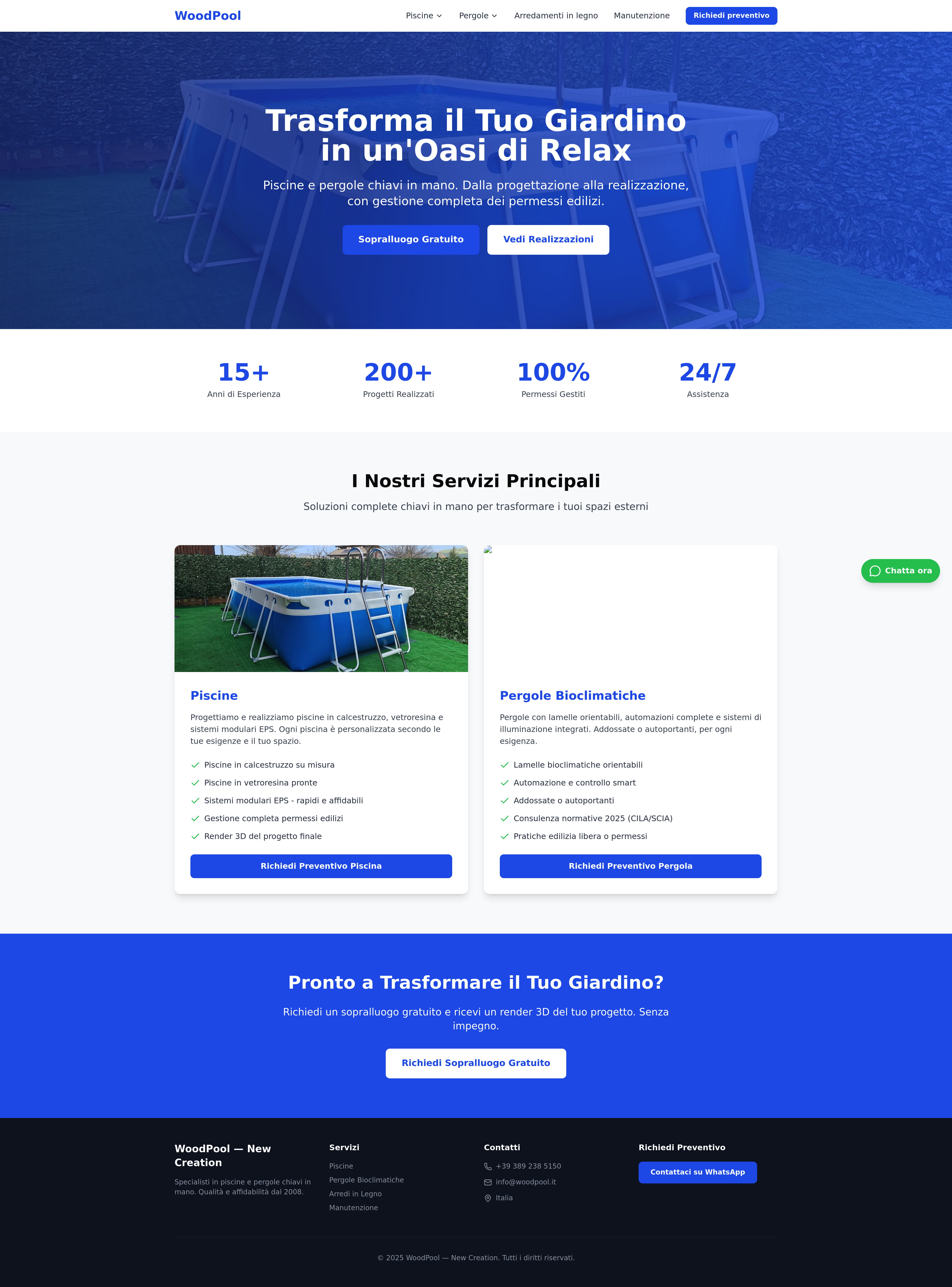 WoodPool specializes in custom-designed pergolas and outdoor wooden furniture. This project focuses on optimizing the website with new product categories like aluminum and wooden bioclimatic pergolas, carports, and design pergolas. It also features an enhanced outdoor wooden furniture section with optimized images, SEO-friendly metadata, and a seamless user experience for lead generation via WhatsApp.