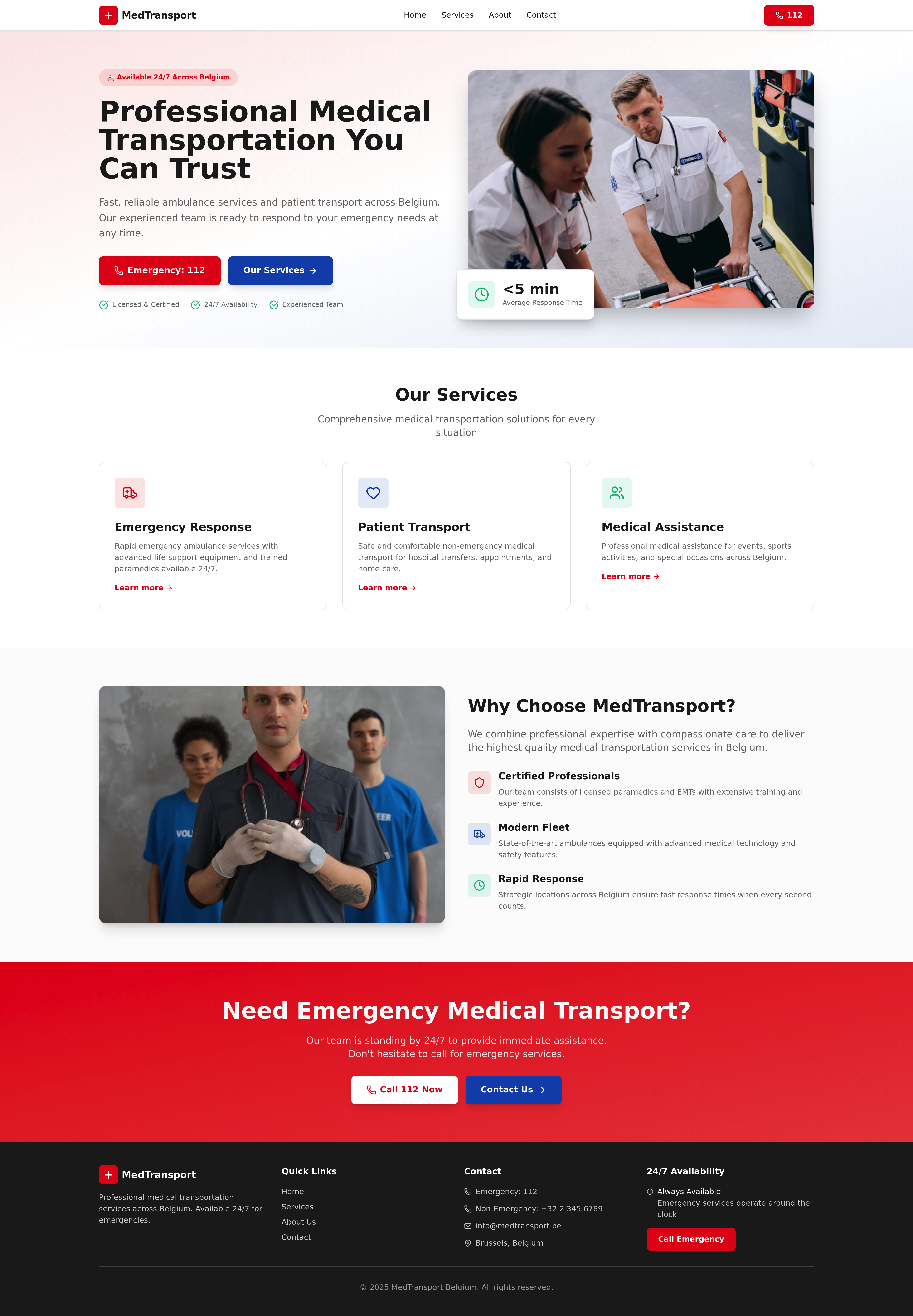 Showcase a modern and reliable Belgian ambulance and medical transportation company with a sleek, responsive website. Features include service overviews, emergency contact information, and a clear call to action for urgent medical transport needs. Designed for quick access to vital information for patients and healthcare providers.